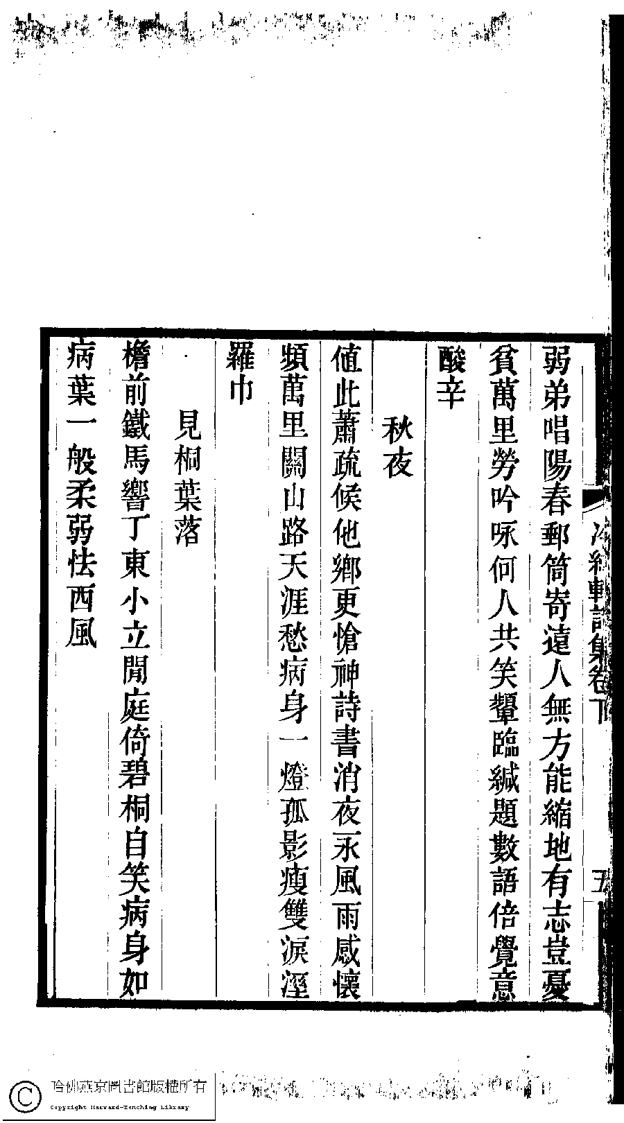 | (PRINT FRIENDLY VERSION) 冷紅軒詩集﹕二卷﹐附詞(清百保友蘭撰)。清光緒元年(1875)刻本。 ![]() Page : 下.5b | click for larger image | Back |