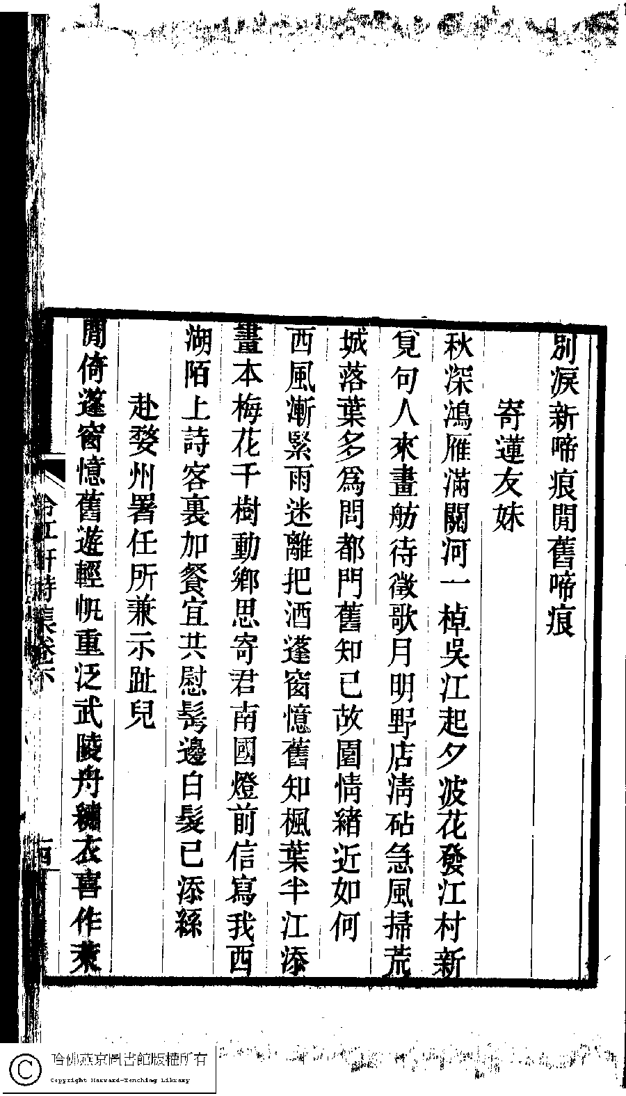 | (PRINT FRIENDLY VERSION) 冷紅軒詩集﹕二卷﹐附詞(清百保友蘭撰)。清光緒元年(1875)刻本。 ![]() Page : 下.14a | click for larger image | 冷紅軒詩集﹕二卷﹐附詞(清百保友蘭撰)。清光緒元年(1875)刻本。![]() Page : 下.13b | click for larger image | Back |