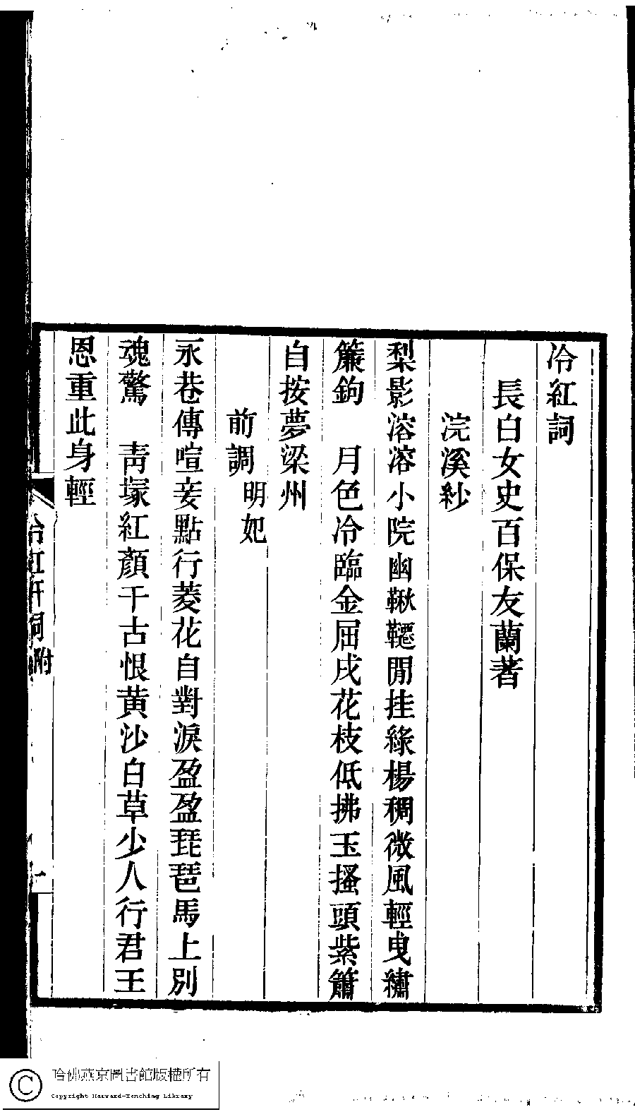 | (PRINT FRIENDLY VERSION) 冷紅軒詩集﹕二卷﹐附詞(清百保友蘭撰)。清光緒元年(1875)刻本。 ![]() Page : 附.1a | click for larger image | Back |