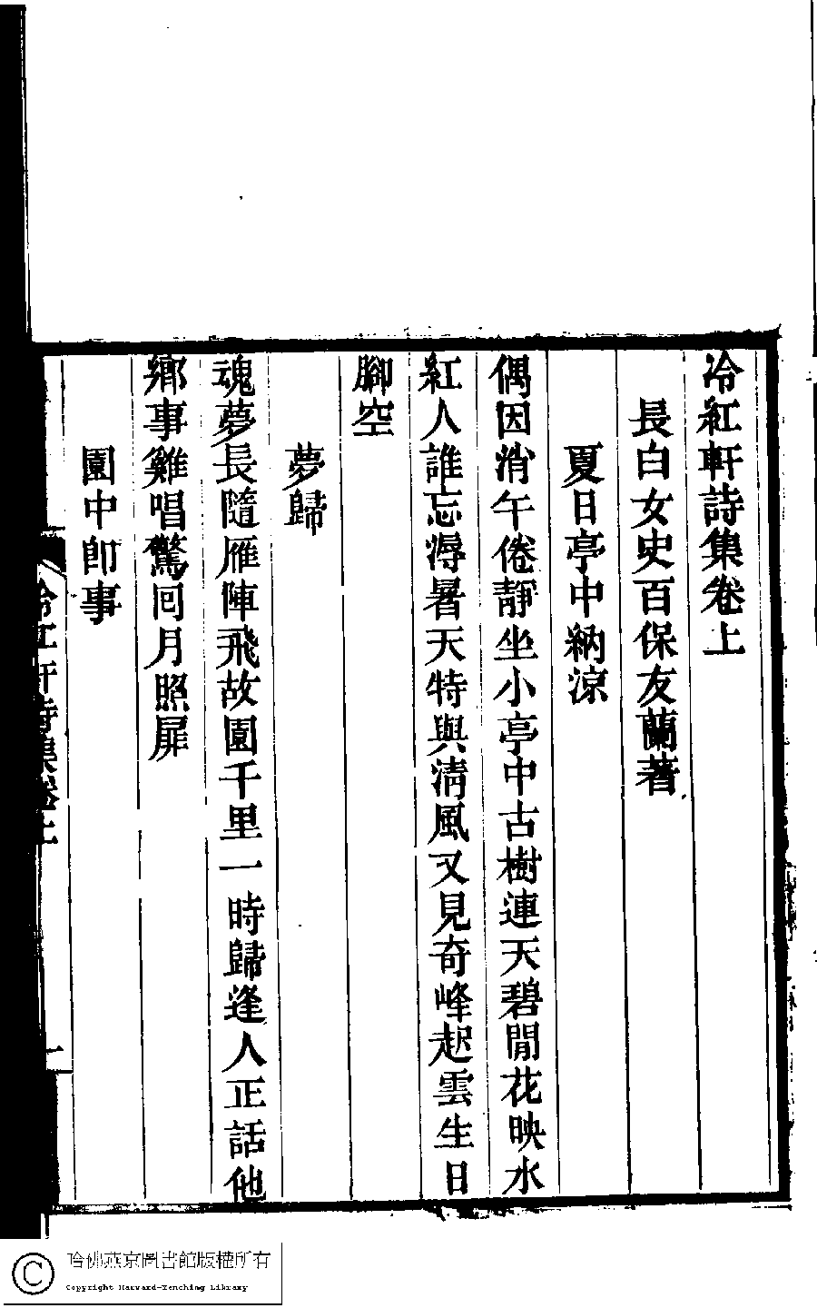| (PRINT FRIENDLY VERSION) 冷紅軒詩集﹕二卷﹐附詞(清百保友蘭撰)。清光緒八年(1882)刻本。 ![]() Page : 上.1a | click for larger image | Back |