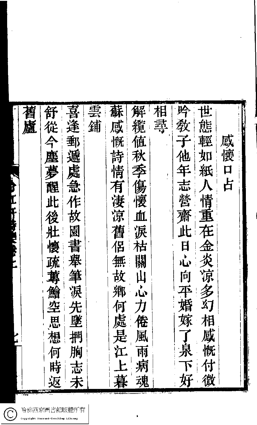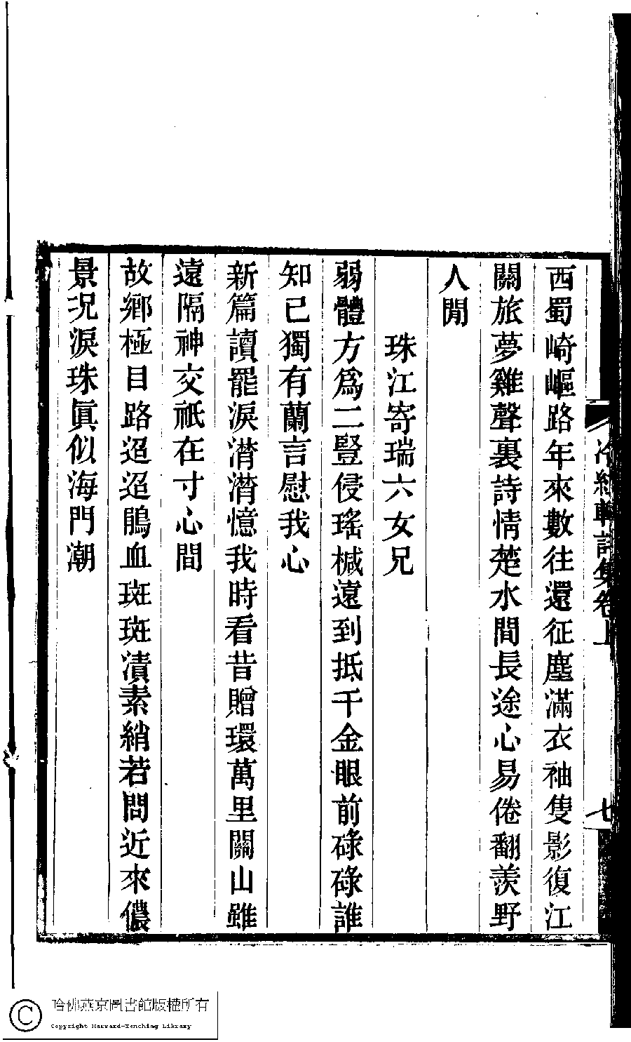 | (PRINT FRIENDLY VERSION) 冷紅軒詩集﹕二卷﹐附詞(清百保友蘭撰)。清光緒八年(1882)刻本。 ![]() Page : 上.7b | click for larger image | 冷紅軒詩集﹕二卷﹐附詞(清百保友蘭撰)。清光緒八年(1882)刻本。![]() Page : 上.7a | click for larger image | Back |