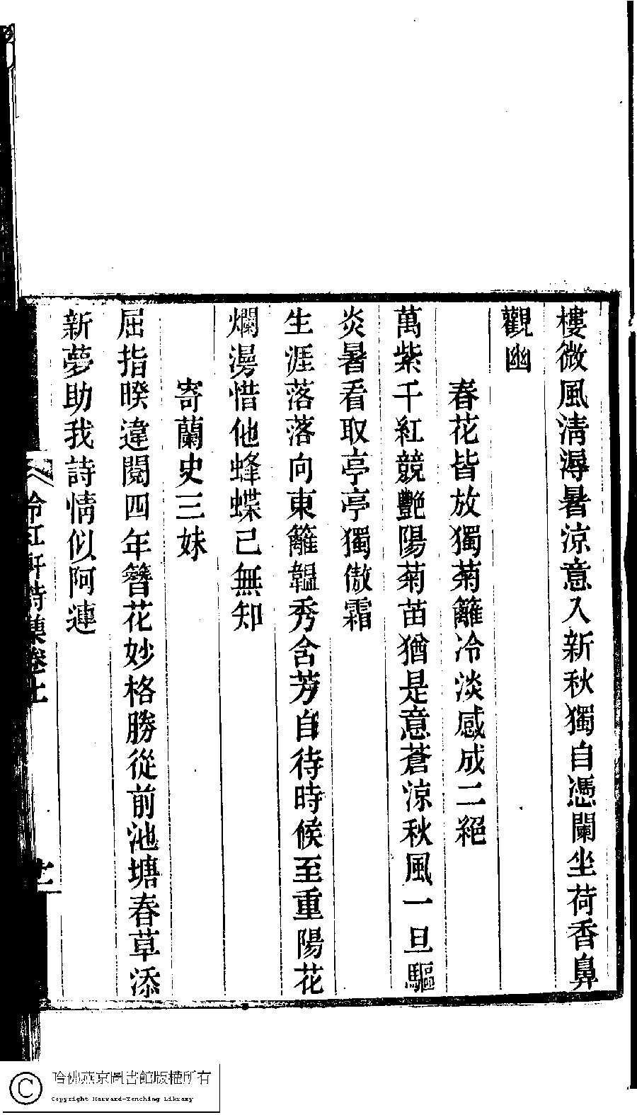 | (PRINT FRIENDLY VERSION) 冷紅軒詩集﹕二卷﹐附詞(清百保友蘭撰)。清光緒八年(1882)刻本。 ![]() Page : 上.11a | click for larger image | 冷紅軒詩集﹕二卷﹐附詞(清百保友蘭撰)。清光緒八年(1882)刻本。![]() Page : 上.10b | click for larger image | Back |