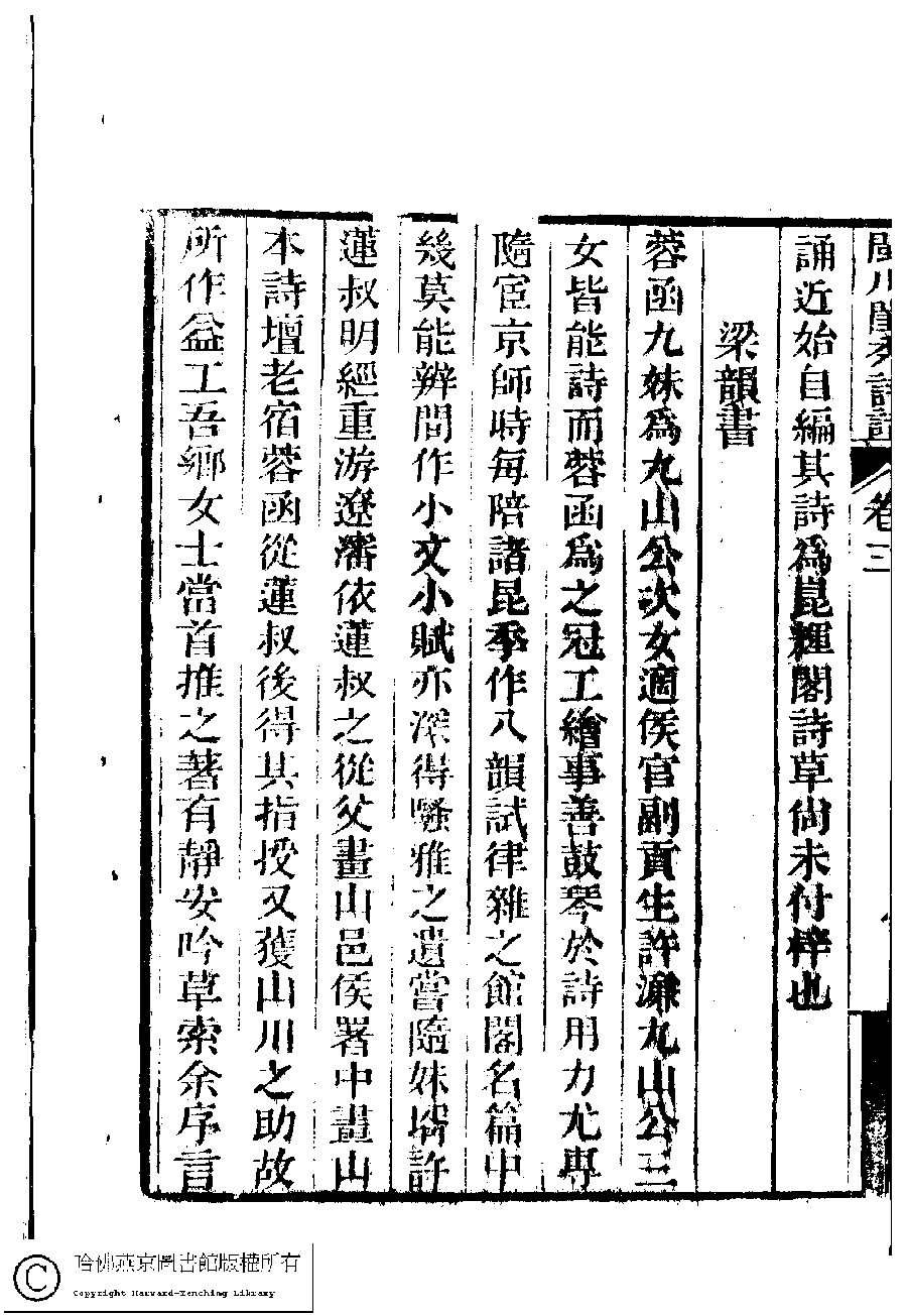 | (PRINT FRIENDLY VERSION) 閩川閨秀詩話﹕四卷(清梁章鉅撰)。光緖元年(1875)清刻本 ![]() Page : 3.8b | click for larger image | 閩川閨秀詩話﹕四卷(清梁章鉅撰)。光緖元年(1875)清刻本![]() Page : 3.8a | click for larger image | 閩川閨秀詩話﹕四卷(清梁章鉅撰)。光緖元年(1875)清刻本![]() Page : 3.7b | click for larger image | Back |