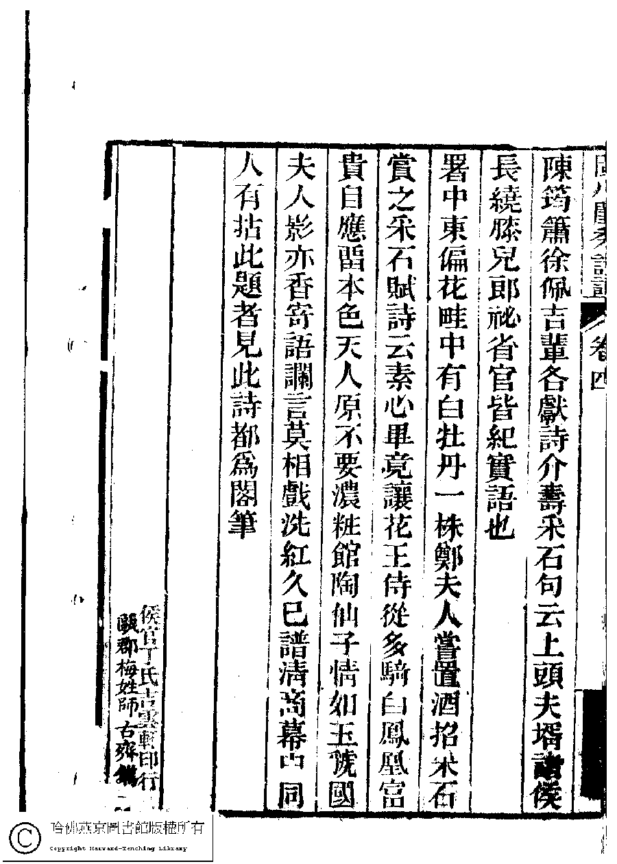 | (PRINT FRIENDLY VERSION) 閩川閨秀詩話﹕四卷(清梁章鉅撰) ![]() Page : 4.20a | click for larger image | 閩川閨秀詩話﹕四卷(清梁章鉅撰)![]() Page : 4.19b | click for larger image | 閩川閨秀詩話﹕四卷(清梁章鉅撰)![]() Page : 4.19a | click for larger image | 閩川閨秀詩話﹕四卷(清梁章鉅撰)![]() Page : 4.18b | click for larger image |