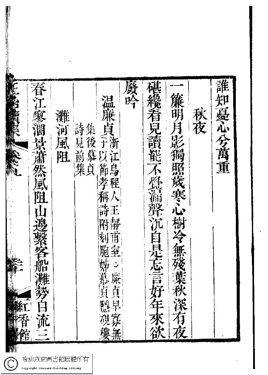 | (PRINT FRIENDLY VERSION) 國朝閨秀正始續集﹕十卷﹐附錄﹕一卷﹐補遺﹕一卷﹐輓詞﹕一卷(清惲珠輯)。清道光十六年(1836)紅香館刻本。 ![]() Page : 5.21a | click for larger image | Back |