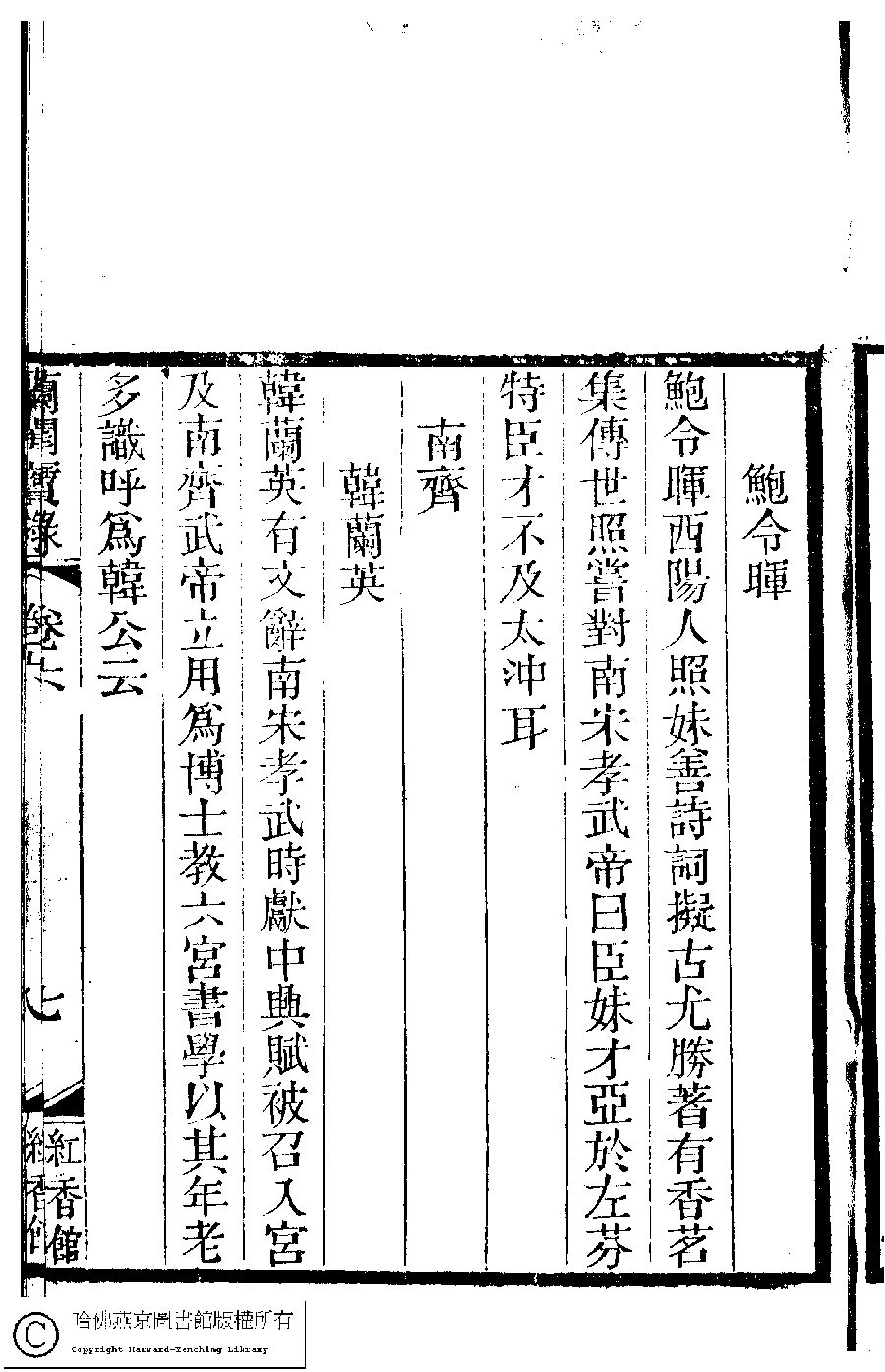 | (PRINT FRIENDLY VERSION) 蘭閨寶錄﹕六卷(清惲珠輯)。清道光十一年(1831)紅香館刻本。 ![]() Page : 6.7a | click for larger image | Back |