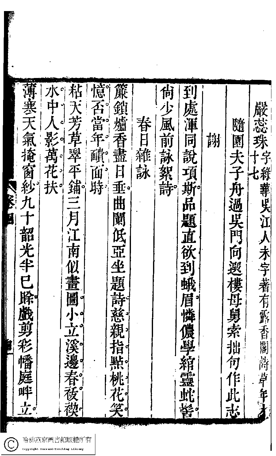 | Appears in: Suiyuan nü di zi shi xuan: 6 juan (edited by Yuan Mei, Qing dynasty) |