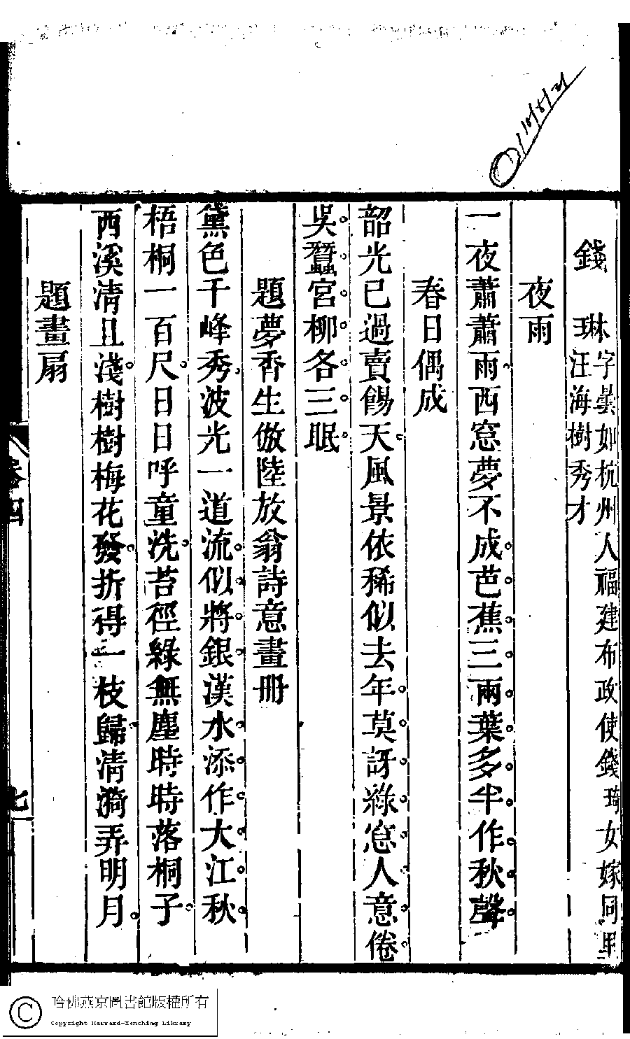 | Appears in: Suiyuan nü di zi shi xuan: 6 juan (edited by Yuan Mei, Qing dynasty) |