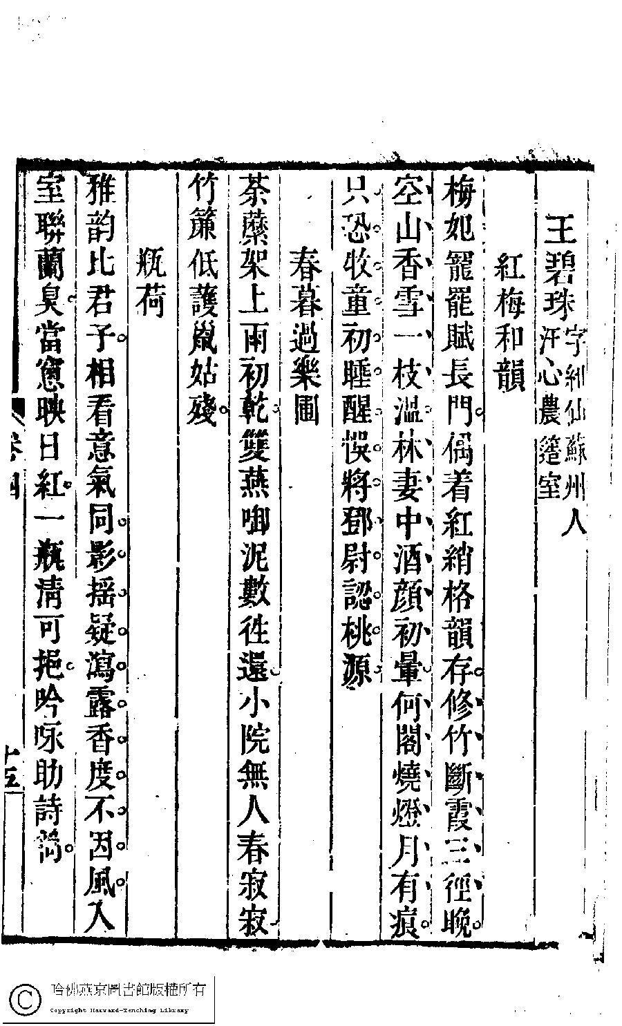 | Appears in: Suiyuan nü di zi shi xuan: 6 juan (edited by Yuan Mei, Qing dynasty) |