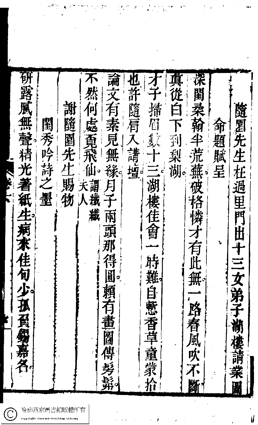 | Appears in: Suiyuan nü di zi shi xuan: 6 juan (edited by Yuan Mei, Qing dynasty) |
