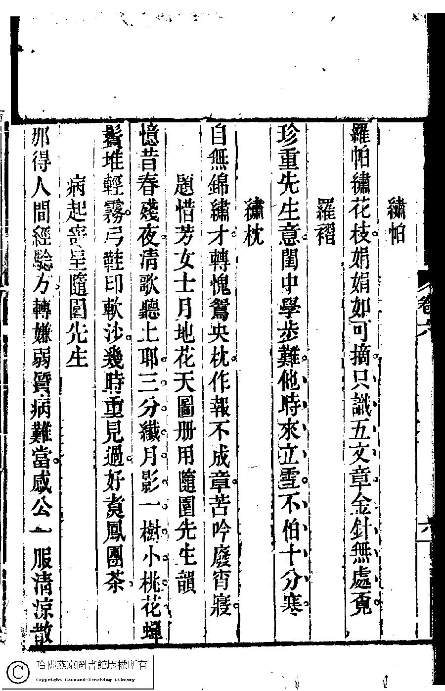 | Appears in: Suiyuan nü di zi shi xuan: 6 juan (edited by Yuan Mei, Qing dynasty) |