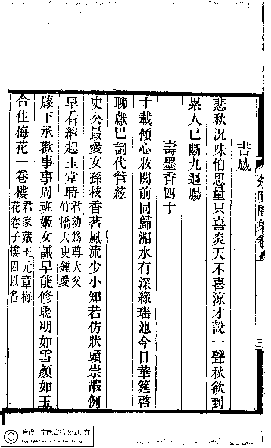 | (PRINT FRIENDLY VERSION) 楚畹閣集﹕十二卷(清季蘭韻撰)。清道光二十七年(1847)刻本 ![]() Page : 5.3b | click for larger image | Back |