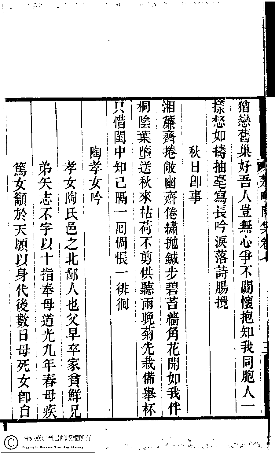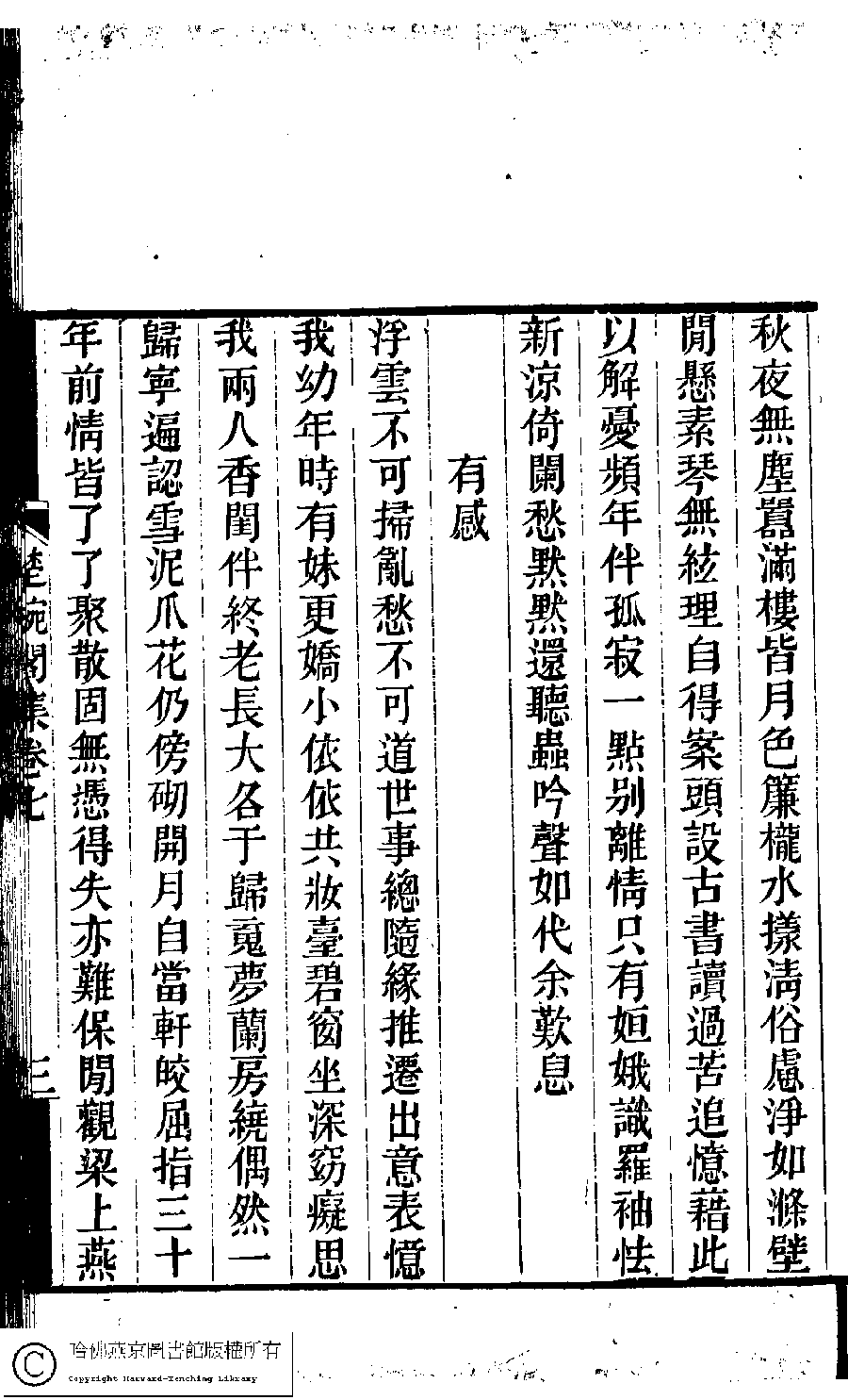 | (PRINT FRIENDLY VERSION) 楚畹閣集﹕十二卷(清季蘭韻撰)。清道光二十七年(1847)刻本 ![]() Page : 7.3b | click for larger image | 楚畹閣集﹕十二卷(清季蘭韻撰)。清道光二十七年(1847)刻本![]() Page : 7.3a | click for larger image | Back |
