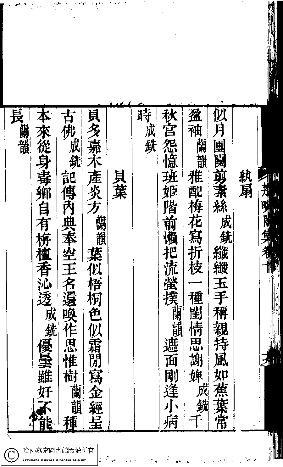 | (PRINT FRIENDLY VERSION) 楚畹閣集﹕十二卷(清季蘭韻撰)。清道光二十七年(1847)刻本 ![]() Page : 10.19b | click for larger image | Back |