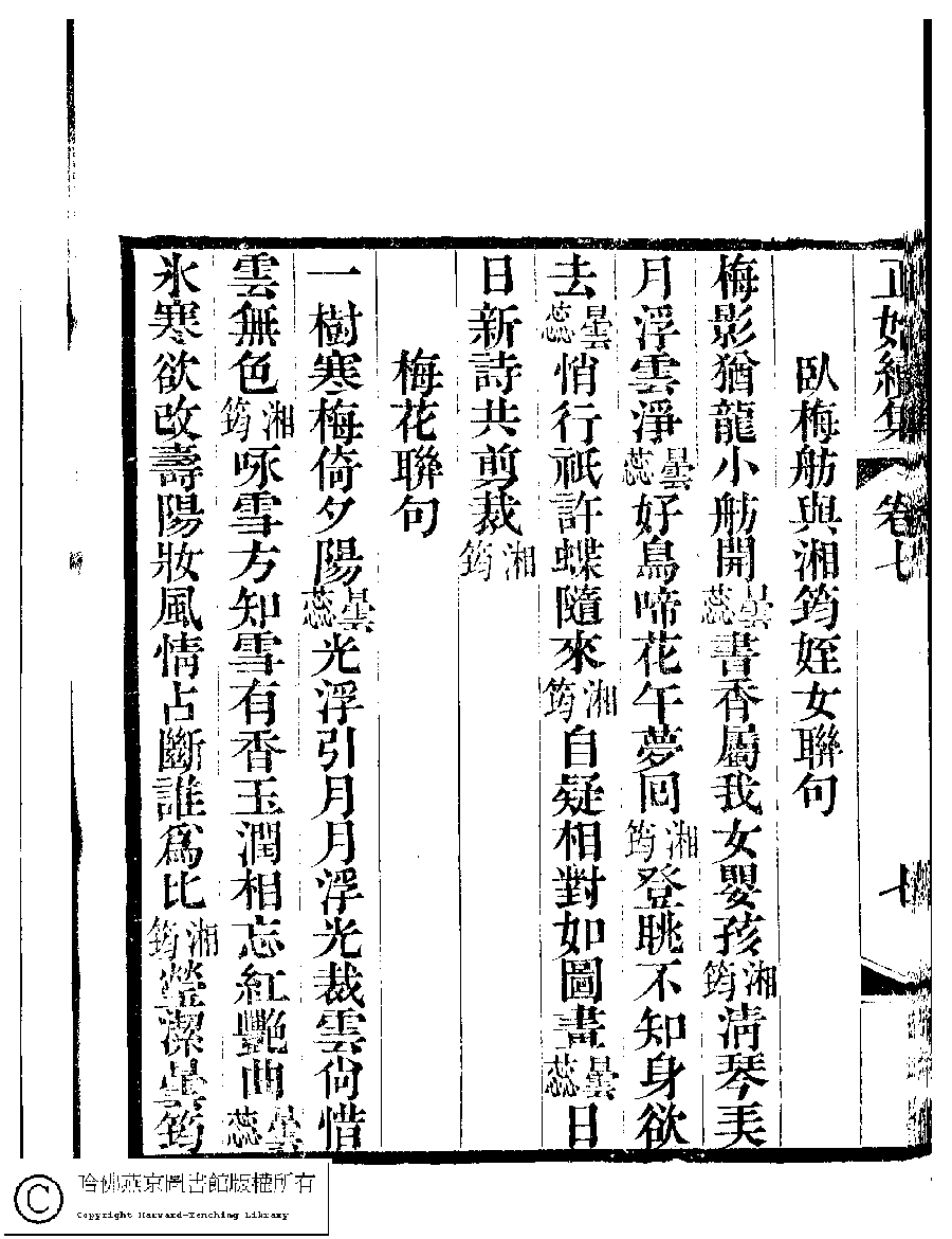 | (PRINT FRIENDLY VERSION) 國朝閨秀正始續集﹕十卷﹐附錄﹕一卷﹐補遺﹕一卷﹐輓詞﹕一卷(清惲珠輯)。清道光十六年(1836)紅香館刻本。 ![]() Page : 7.7b | click for larger image | Back |