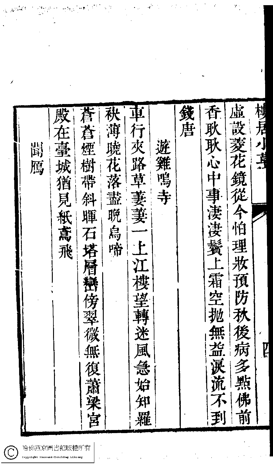 | (PRINT FRIENDLY VERSION) 樓居小草﹕一卷(清袁杼撰)。清嘉慶間(1796-1820)刻本。 ![]() Page : 4b | click for larger image | Back |