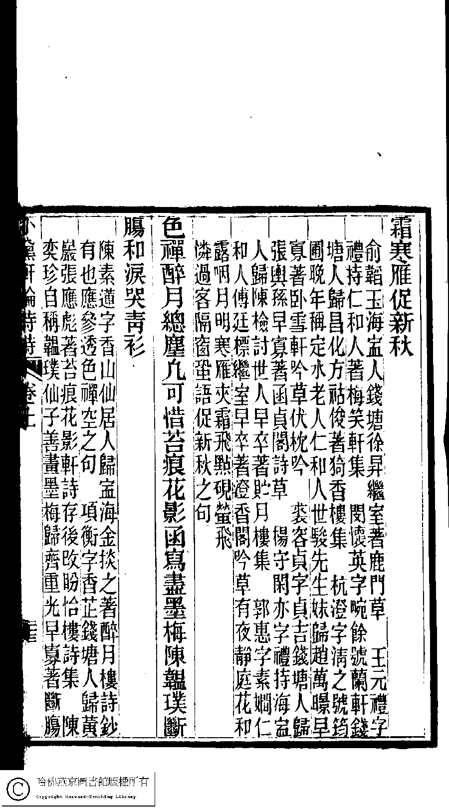| (PRINT FRIENDLY VERSION) 陳孝女遺集﹕二卷﹔小黛軒論詩詩﹕二卷(清陳芸撰)。民國三年(1914)刻本 ![]() Page : 上.23a | click for larger image | 陳孝女遺集﹕二卷﹔小黛軒論詩詩﹕二卷(清陳芸撰)。民國三年(1914)刻本![]() Page : 上.22b | click for larger image | Back |