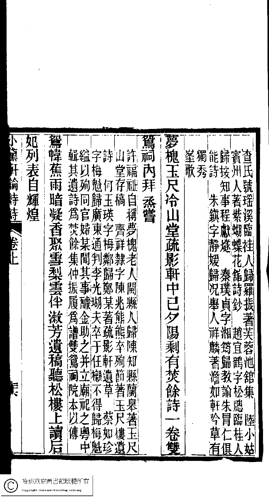 | (PRINT FRIENDLY VERSION) 陳孝女遺集﹕二卷﹔小黛軒論詩詩﹕二卷(清陳芸撰)。民國三年(1914)刻本 ![]() Page : 上.26a | click for larger image | 陳孝女遺集﹕二卷﹔小黛軒論詩詩﹕二卷(清陳芸撰)。民國三年(1914)刻本![]() Page : 上.25b | click for larger image | Back |