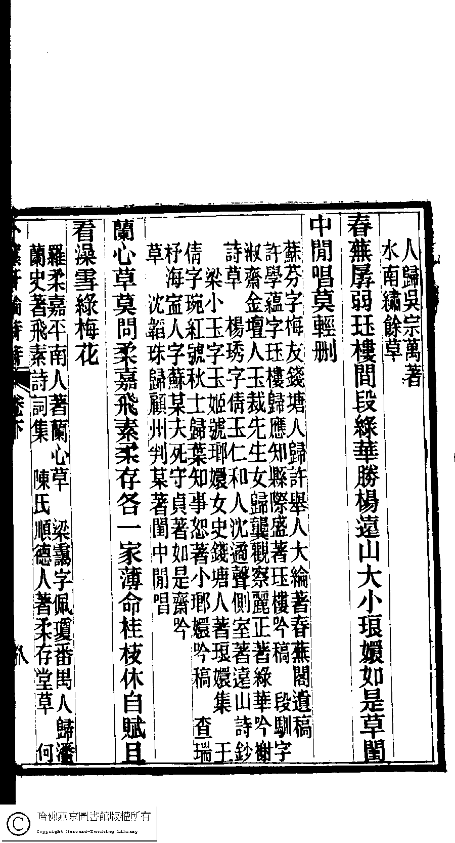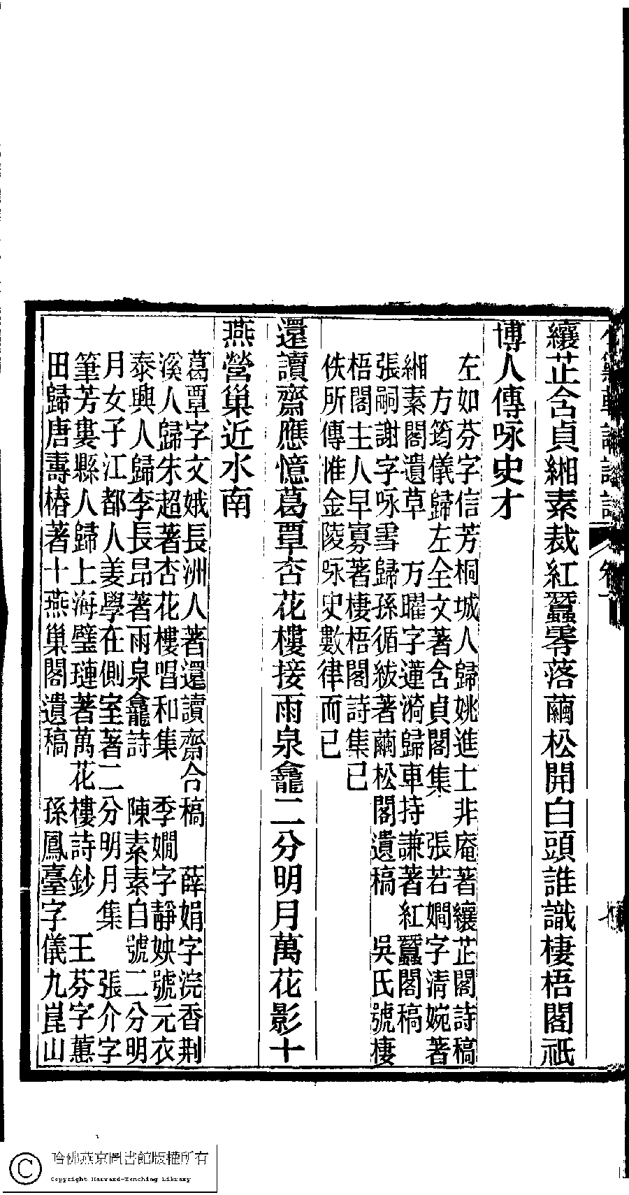 | (PRINT FRIENDLY VERSION) 陳孝女遺集﹕二卷﹔小黛軒論詩詩﹕二卷(清陳芸撰)。民國三年(1914)刻本 ![]() Page : 下.8a | click for larger image | 陳孝女遺集﹕二卷﹔小黛軒論詩詩﹕二卷(清陳芸撰)。民國三年(1914)刻本![]() Page : 下.7b | click for larger image | Back |