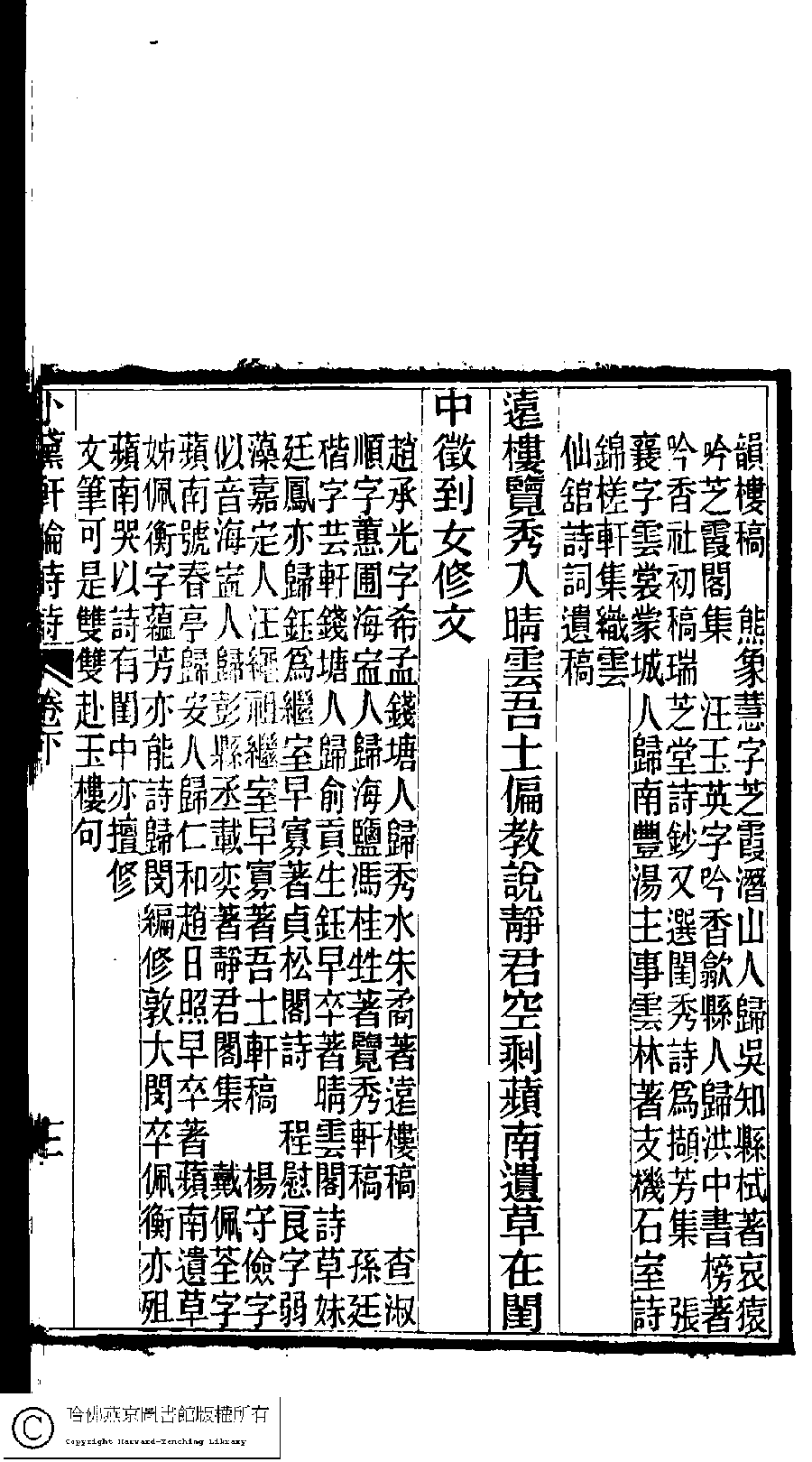 | (PRINT FRIENDLY VERSION) 陳孝女遺集﹕二卷﹔小黛軒論詩詩﹕二卷(清陳芸撰)。民國三年(1914)刻本 ![]() Page : 下.12a | click for larger image | 陳孝女遺集﹕二卷﹔小黛軒論詩詩﹕二卷(清陳芸撰)。民國三年(1914)刻本![]() Page : 下.11b | click for larger image | Back |