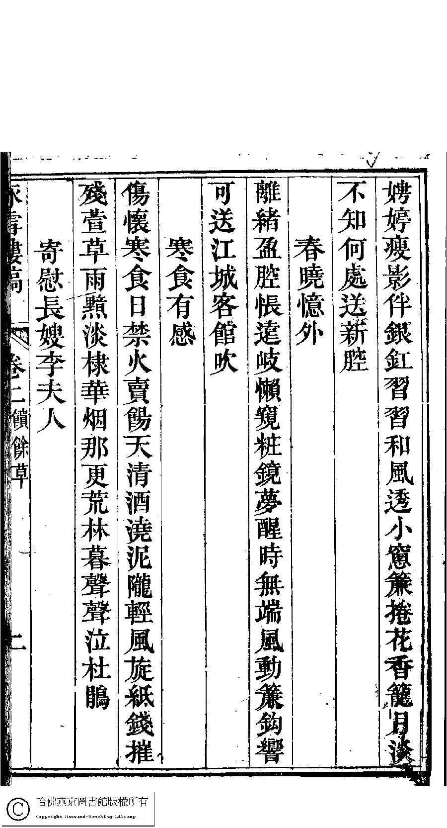 | (PRINT FRIENDLY VERSION) 詠雪樓稿﹕五卷,卷首一卷,附一卷(清甘立媃撰)。清道光二十三年(1843)徐心田半偈齋刻本。 ![]() Page : 2.2a | click for larger image | Back |