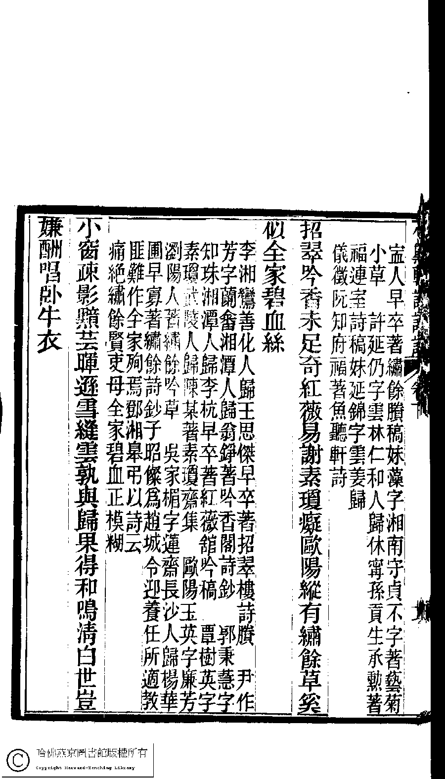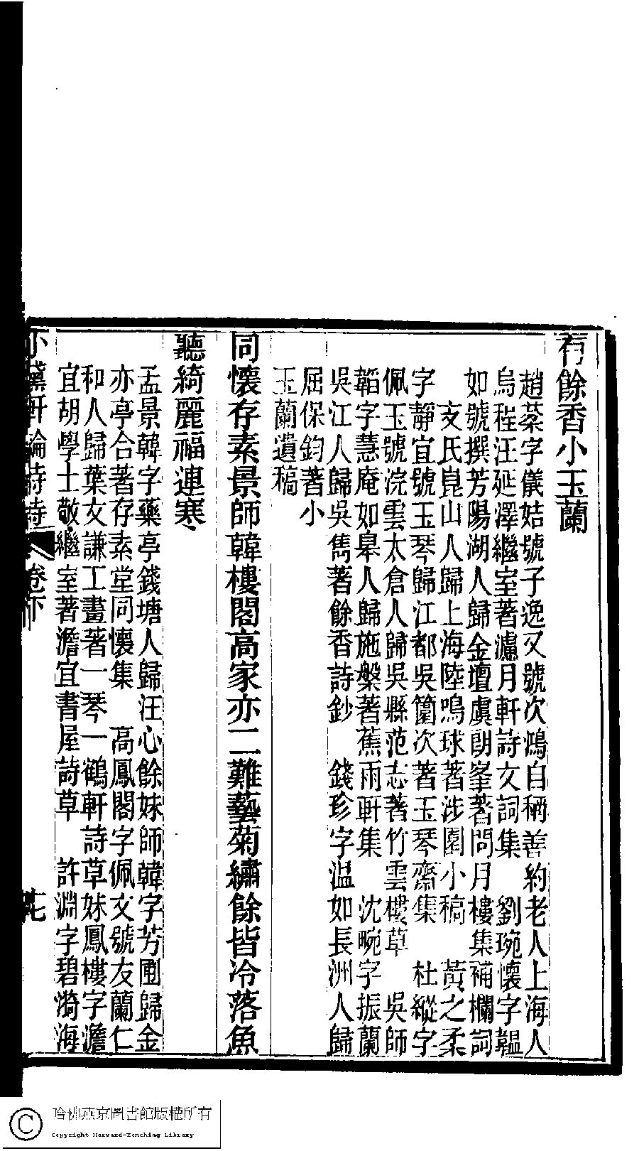 | (PRINT FRIENDLY VERSION) 陳孝女遺集﹕二卷﹔小黛軒論詩詩﹕二卷(清陳芸撰)。民國三年(1914)刻本 ![]() Page : 下.17b | click for larger image | 陳孝女遺集﹕二卷﹔小黛軒論詩詩﹕二卷(清陳芸撰)。民國三年(1914)刻本![]() Page : 下.17a | click for larger image | Back |