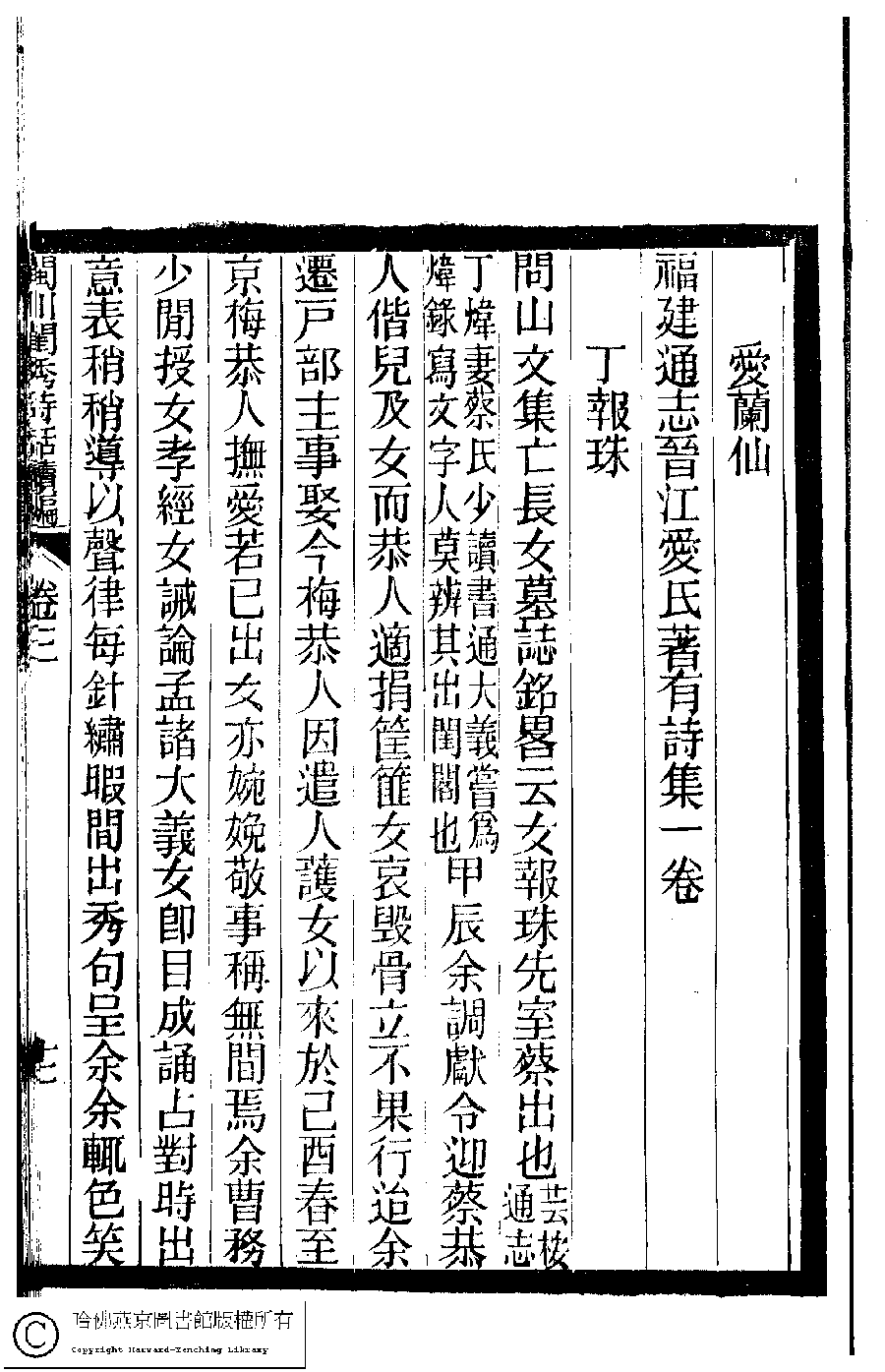 | (PRINT FRIENDLY VERSION) 閩川閨秀詩話續編﹕四卷(清丁芸輯)。民國三年(1914)刻本。 ![]() Page : 3.12a | click for larger image | Back |