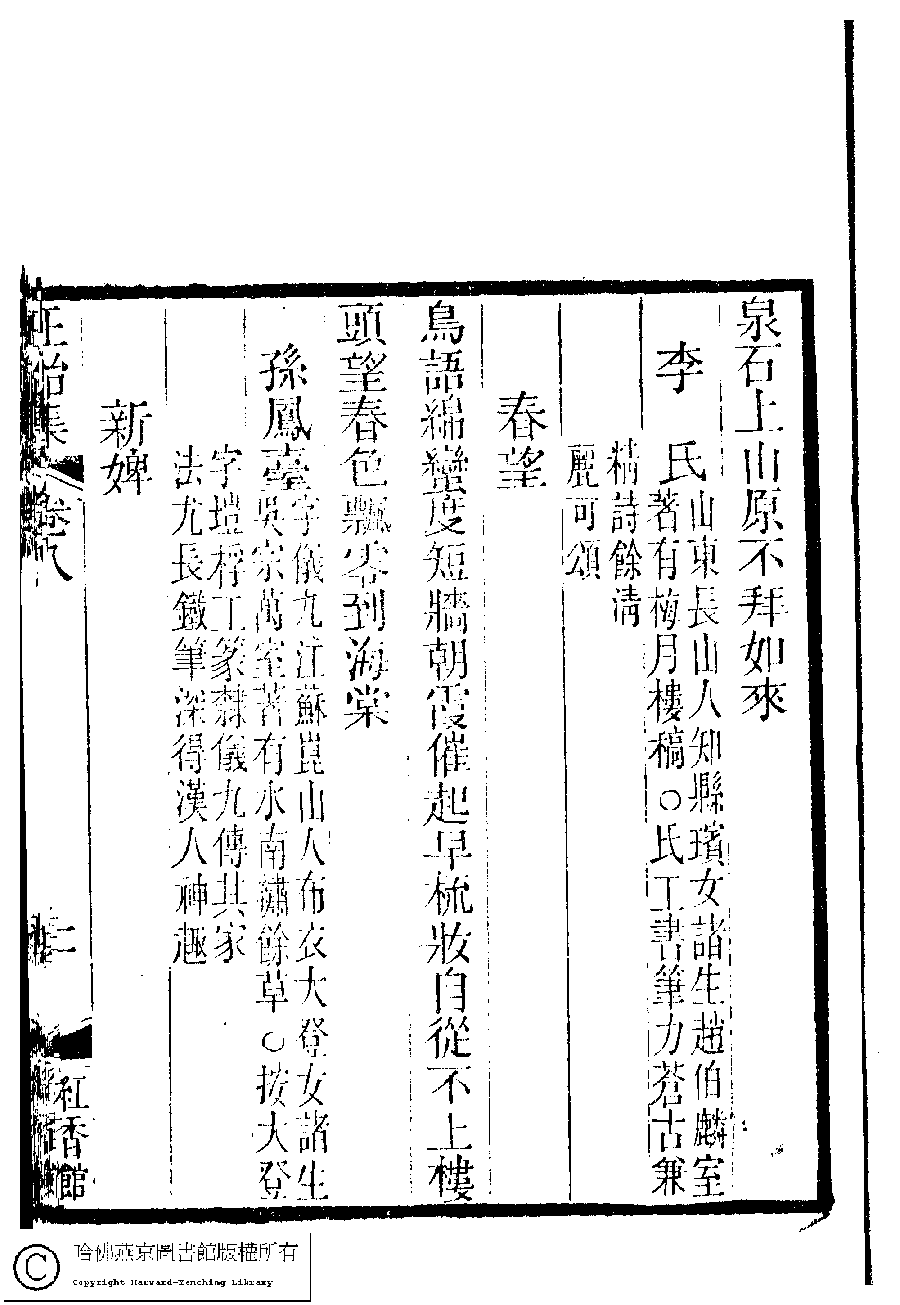 | (PRINT FRIENDLY VERSION) 國朝閨秀正始集﹕二十卷﹐附錄﹕一卷﹐補遺﹕一卷﹐又附題詞﹕一卷(清惲珠輯)。清道光十一年(1831)紅香館刻本。 ![]() Page : 8.11a | click for larger image | Back |