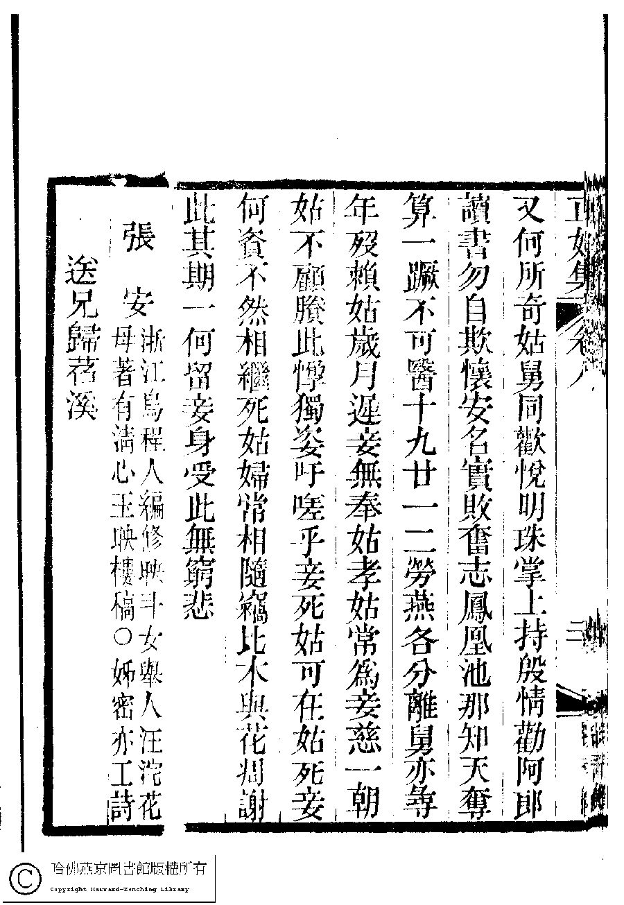 | (PRINT FRIENDLY VERSION) 國朝閨秀正始集﹕二十卷﹐附錄﹕一卷﹐補遺﹕一卷﹐又附題詞﹕一卷(清惲珠輯)。清道光十一年(1831)紅香館刻本。 ![]() Page : 8.20b | click for larger image | Back |