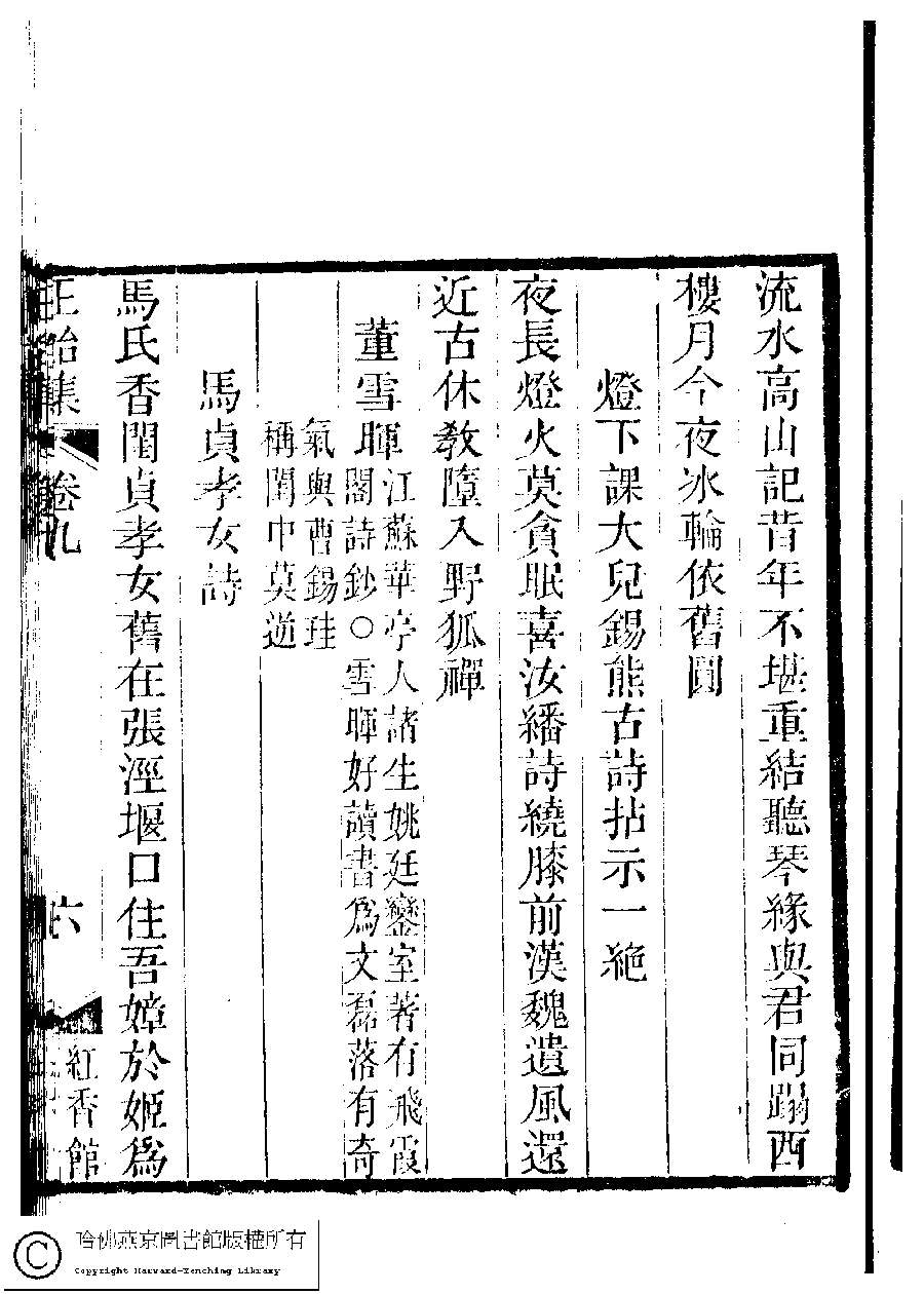 | (PRINT FRIENDLY VERSION) 國朝閨秀正始集﹕二十卷﹐附錄﹕一卷﹐補遺﹕一卷﹐又附題詞﹕一卷(清惲珠輯)。清道光十一年(1831)紅香館刻本。 ![]() Page : 9.6a | click for larger image | Back |