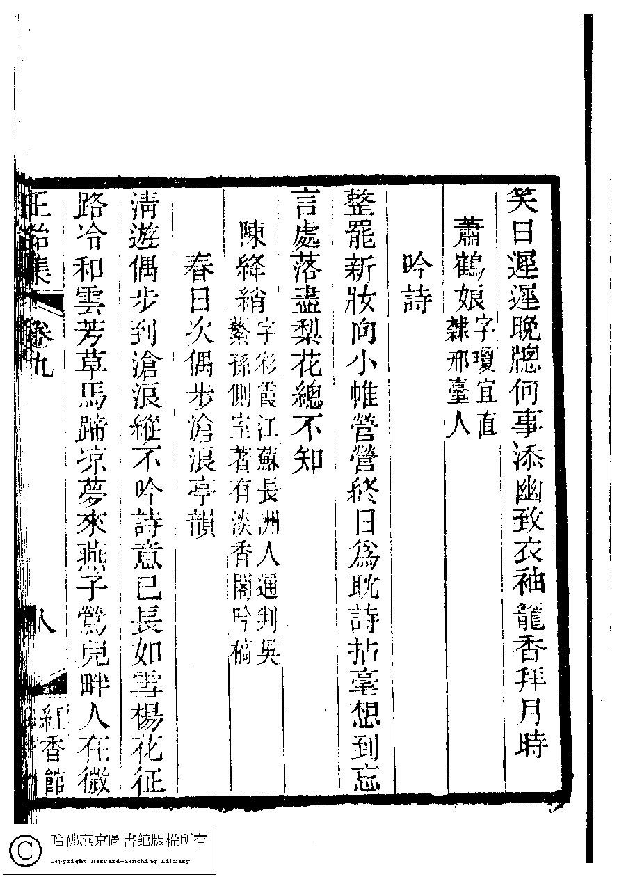 | (PRINT FRIENDLY VERSION) 國朝閨秀正始集﹕二十卷﹐附錄﹕一卷﹐補遺﹕一卷﹐又附題詞﹕一卷(清惲珠輯)。清道光十一年(1831)紅香館刻本。 ![]() Page : 9.9a | click for larger image | Back |