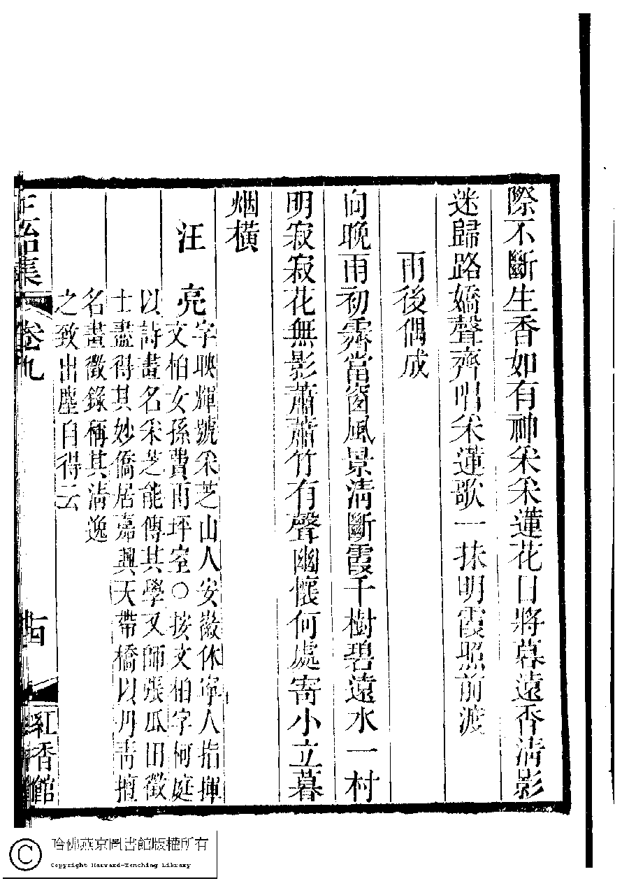 | (PRINT FRIENDLY VERSION) 國朝閨秀正始集﹕二十卷﹐附錄﹕一卷﹐補遺﹕一卷﹐又附題詞﹕一卷(清惲珠輯)。清道光十一年(1831)紅香館刻本。 ![]() Page : 9.15a | click for larger image | Back |