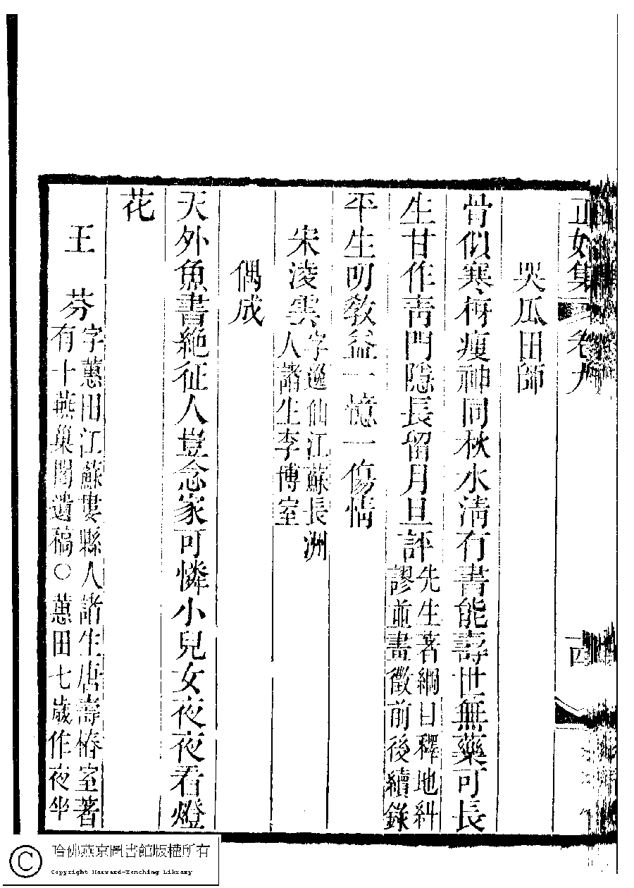 | (PRINT FRIENDLY VERSION) 國朝閨秀正始集﹕二十卷﹐附錄﹕一卷﹐補遺﹕一卷﹐又附題詞﹕一卷(清惲珠輯)。清道光十一年(1831)紅香館刻本。 ![]() Page : 9.15b | click for larger image | Back |