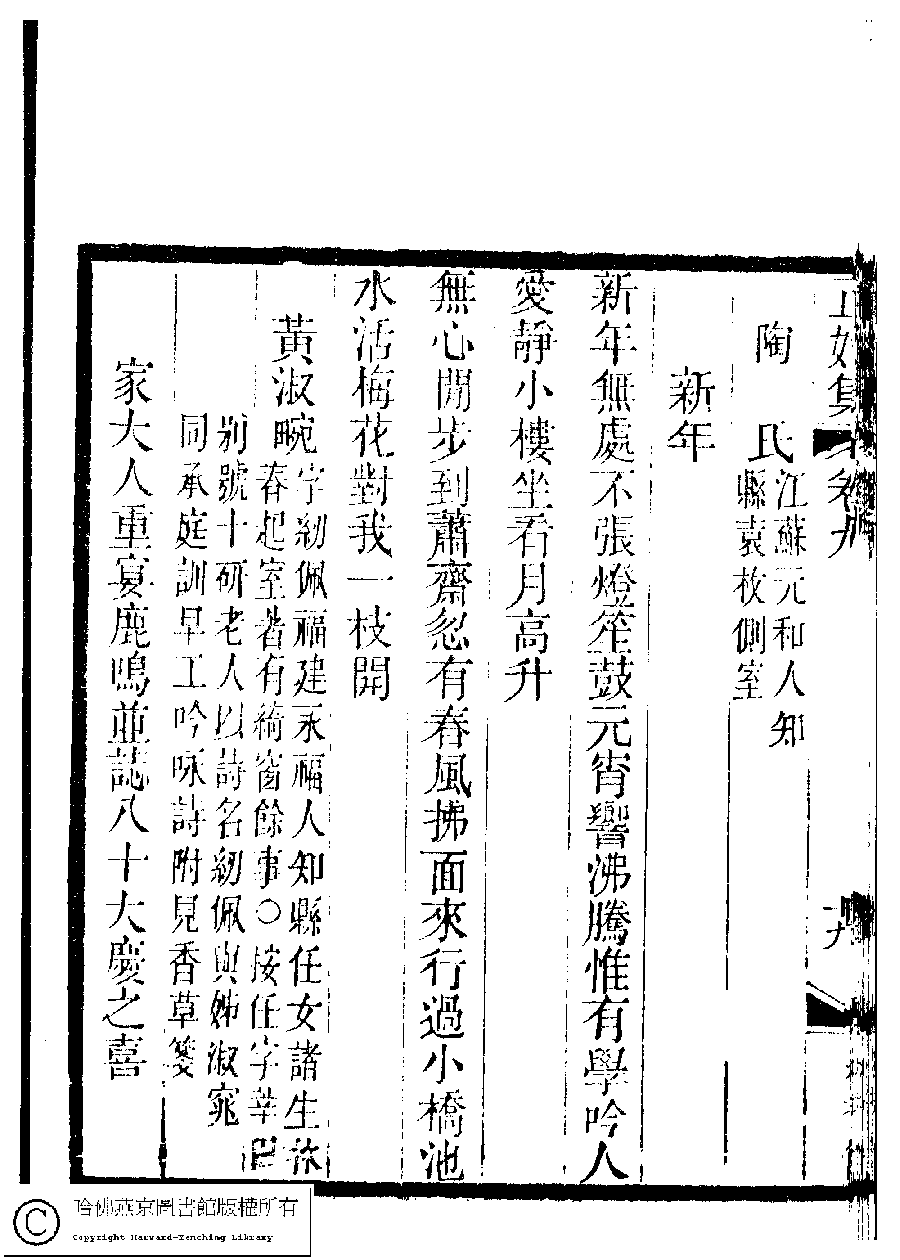 | (PRINT FRIENDLY VERSION) 國朝閨秀正始集﹕二十卷﹐附錄﹕一卷﹐補遺﹕一卷﹐又附題詞﹕一卷(清惲珠輯)。清道光十一年(1831)紅香館刻本。 ![]() Page : 9.19b | click for larger image | Back |