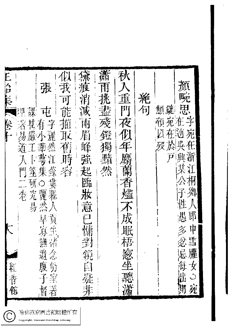 | (PRINT FRIENDLY VERSION) 國朝閨秀正始集﹕二十卷﹐附錄﹕一卷﹐補遺﹕一卷﹐又附題詞﹕一卷(清惲珠輯)。清道光十一年(1831)紅香館刻本。 ![]() Page : 10.18a | click for larger image | Back |