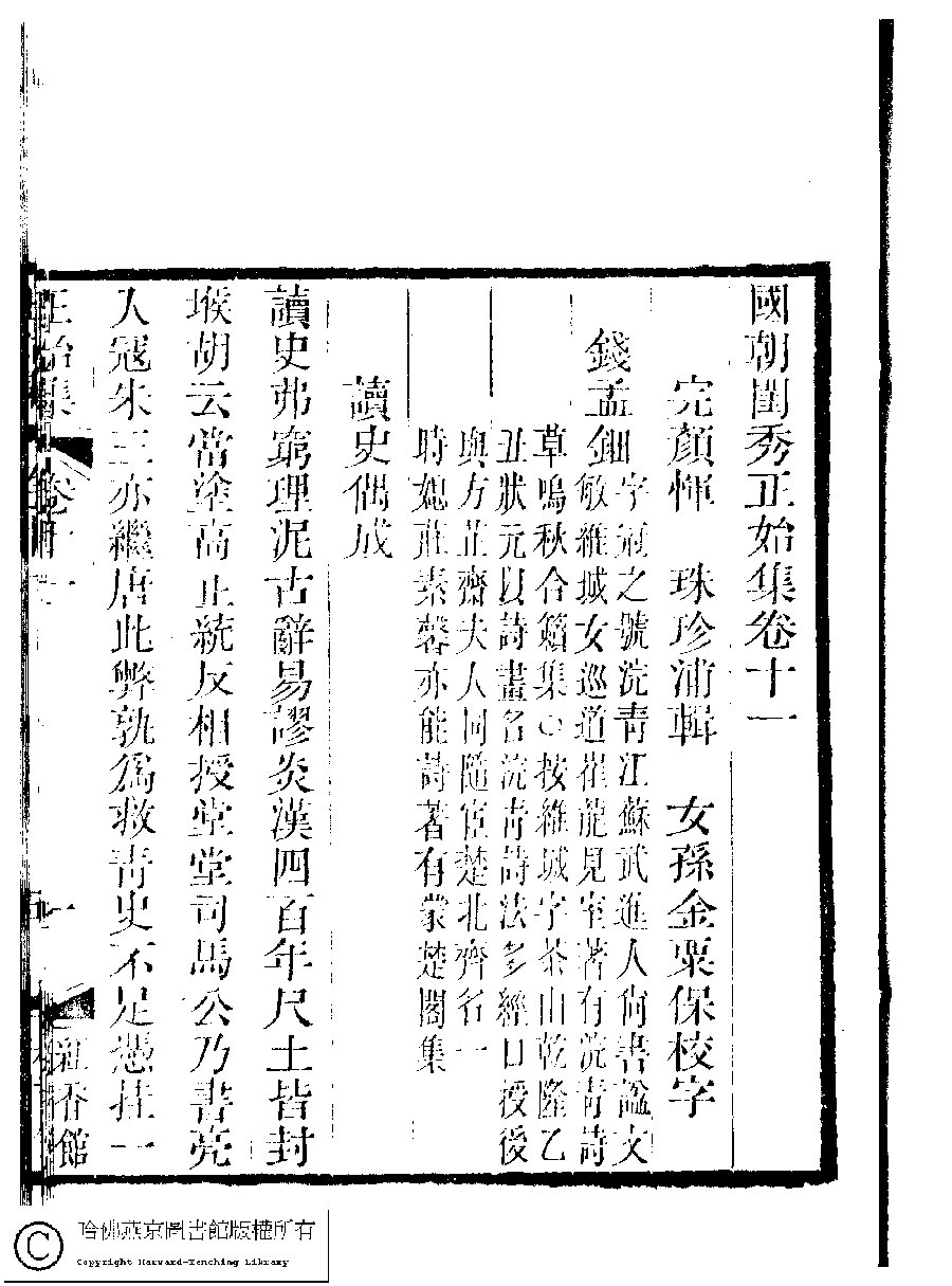| (PRINT FRIENDLY VERSION) 國朝閨秀正始集﹕二十卷﹐附錄﹕一卷﹐補遺﹕一卷﹐又附題詞﹕一卷(清惲珠輯)。清道光十一年(1831)紅香館刻本。 ![]() Page : 11.1a | click for larger image | Back |