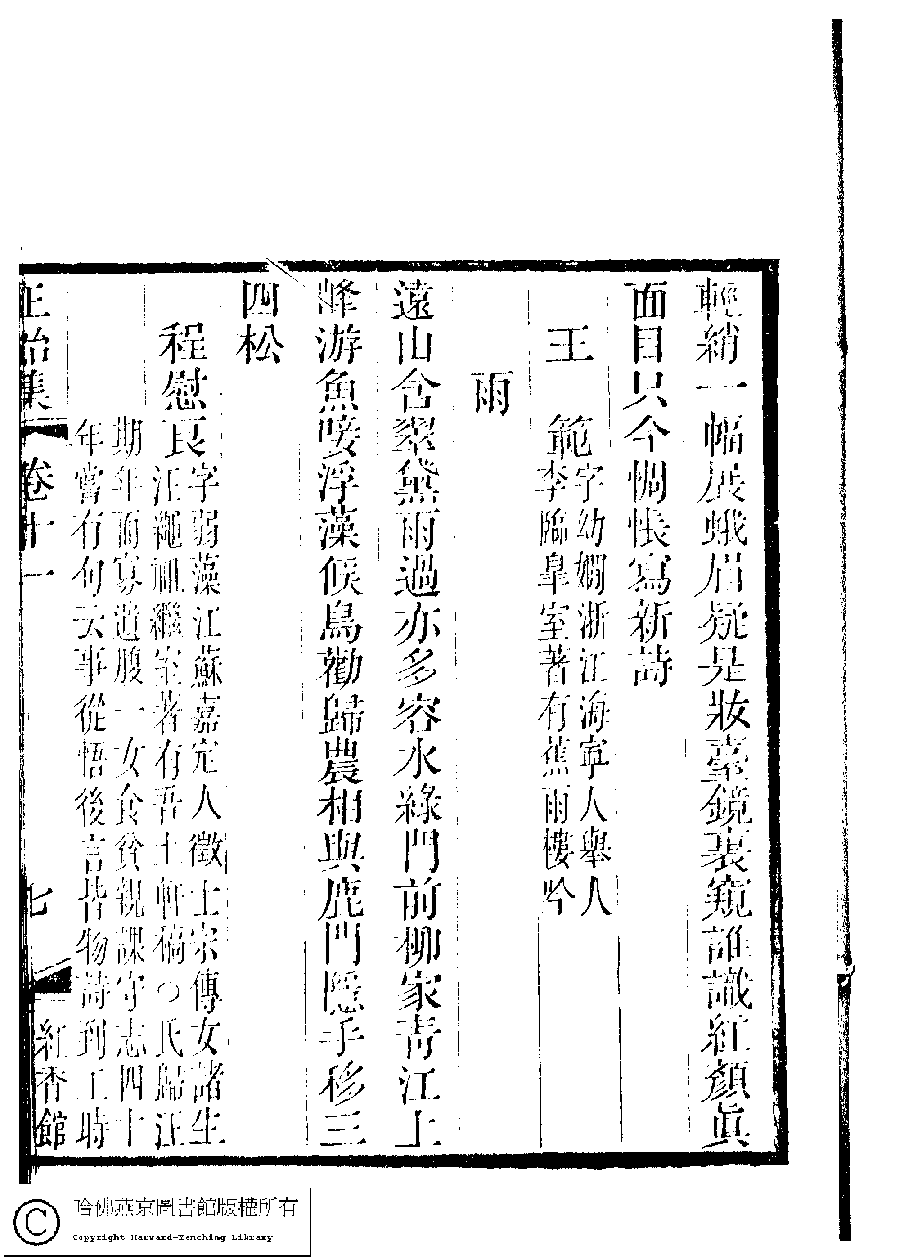 | (PRINT FRIENDLY VERSION) 國朝閨秀正始集﹕二十卷﹐附錄﹕一卷﹐補遺﹕一卷﹐又附題詞﹕一卷(清惲珠輯)。清道光十一年(1831)紅香館刻本。 ![]() Page : 11.7b | click for larger image | 國朝閨秀正始集﹕二十卷﹐附錄﹕一卷﹐補遺﹕一卷﹐又附題詞﹕一卷(清惲珠輯)。清道光十一年(1831)紅香館刻本。![]() Page : 11.7a | click for larger image | Back |