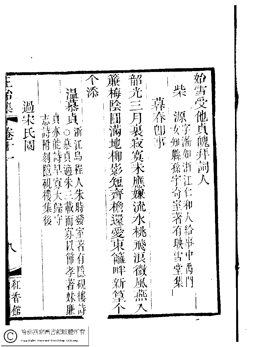 | (PRINT FRIENDLY VERSION) 國朝閨秀正始集﹕二十卷﹐附錄﹕一卷﹐補遺﹕一卷﹐又附題詞﹕一卷(清惲珠輯)。清道光十一年(1831)紅香館刻本。 ![]() Page : 11.8a | click for larger image | Back |