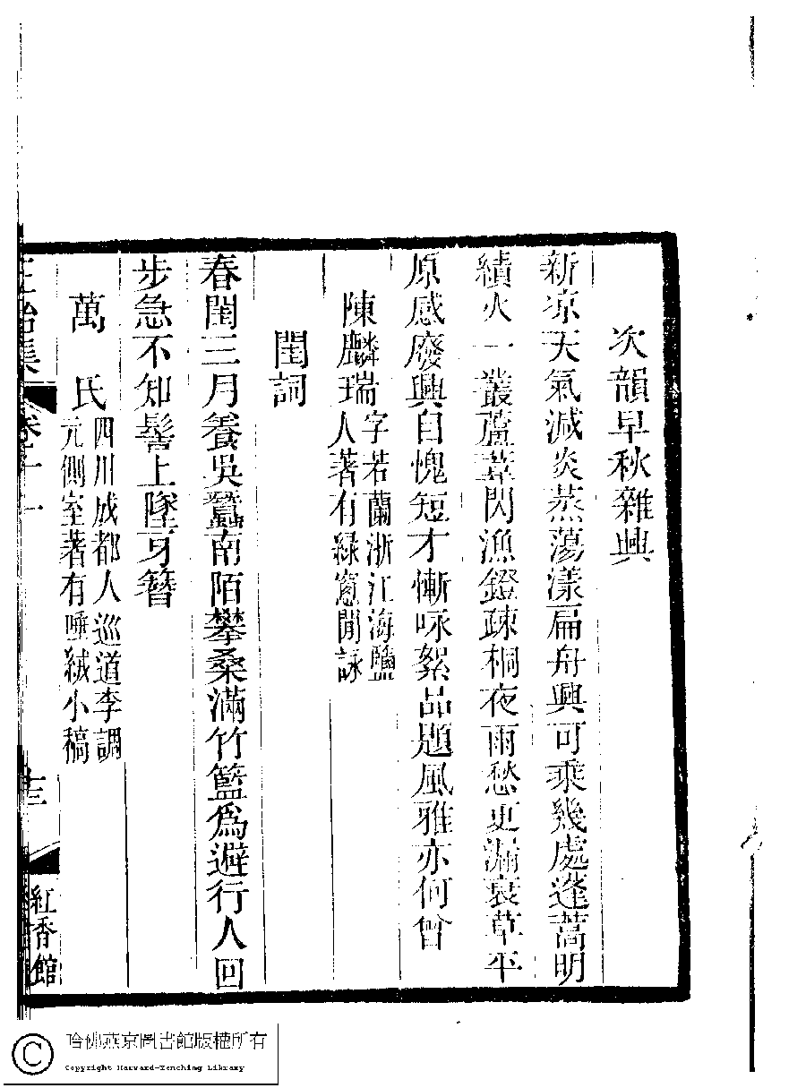 | (PRINT FRIENDLY VERSION) 國朝閨秀正始集﹕二十卷﹐附錄﹕一卷﹐補遺﹕一卷﹐又附題詞﹕一卷(清惲珠輯)。清道光十一年(1831)紅香館刻本。 ![]() Page : 11.13a | click for larger image | Back |