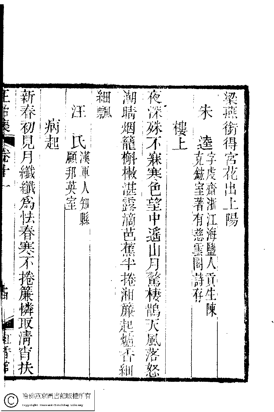 | (PRINT FRIENDLY VERSION) 國朝閨秀正始集﹕二十卷﹐附錄﹕一卷﹐補遺﹕一卷﹐又附題詞﹕一卷(清惲珠輯)。清道光十一年(1831)紅香館刻本。 ![]() Page : 11.14a | click for larger image | Back |