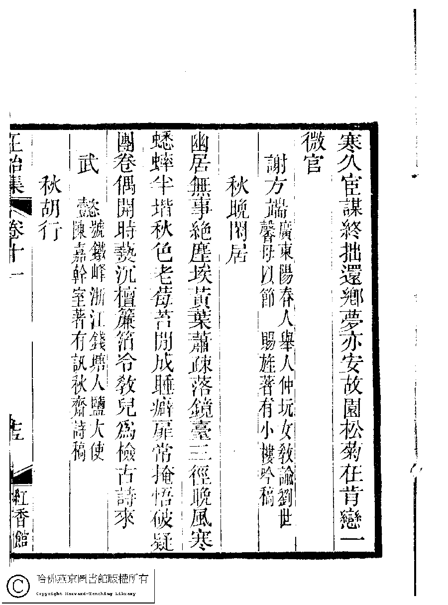 | (PRINT FRIENDLY VERSION) 國朝閨秀正始集﹕二十卷﹐附錄﹕一卷﹐補遺﹕一卷﹐又附題詞﹕一卷(清惲珠輯)。清道光十一年(1831)紅香館刻本。 ![]() Page : 11.15a | click for larger image | Back |