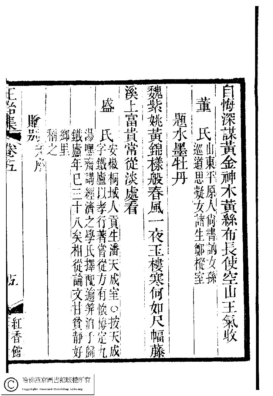 | (PRINT FRIENDLY VERSION) 國朝閨秀正始集﹕二十卷﹐附錄﹕一卷﹐補遺﹕一卷﹐又附題詞﹕一卷(清惲珠輯)。清道光十一年(1831)紅香館刻本。 ![]() Page : 5.5a | click for larger image | Back |