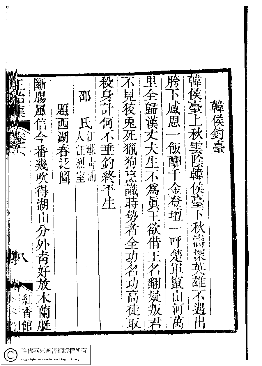 | (PRINT FRIENDLY VERSION) 國朝閨秀正始集﹕二十卷﹐附錄﹕一卷﹐補遺﹕一卷﹐又附題詞﹕一卷(清惲珠輯)。清道光十一年(1831)紅香館刻本。 ![]() Page : 6.8a | click for larger image | Back |