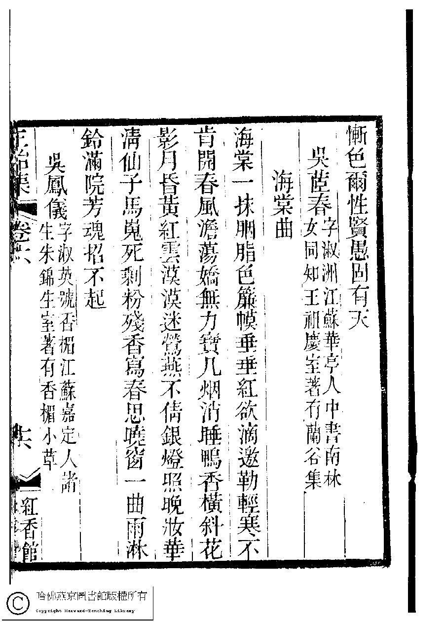 | (PRINT FRIENDLY VERSION) 國朝閨秀正始集﹕二十卷﹐附錄﹕一卷﹐補遺﹕一卷﹐又附題詞﹕一卷(清惲珠輯)。清道光十一年(1831)紅香館刻本。 ![]() Page : 6.16a | click for larger image | Back |