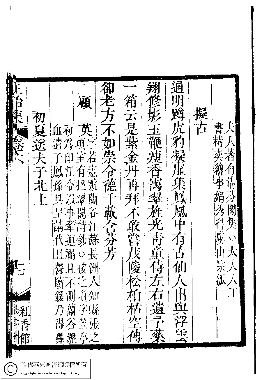 | (PRINT FRIENDLY VERSION) 國朝閨秀正始集﹕二十卷﹐附錄﹕一卷﹐補遺﹕一卷﹐又附題詞﹕一卷(清惲珠輯)。清道光十一年(1831)紅香館刻本。 ![]() Page : 6.17a | click for larger image | Back |