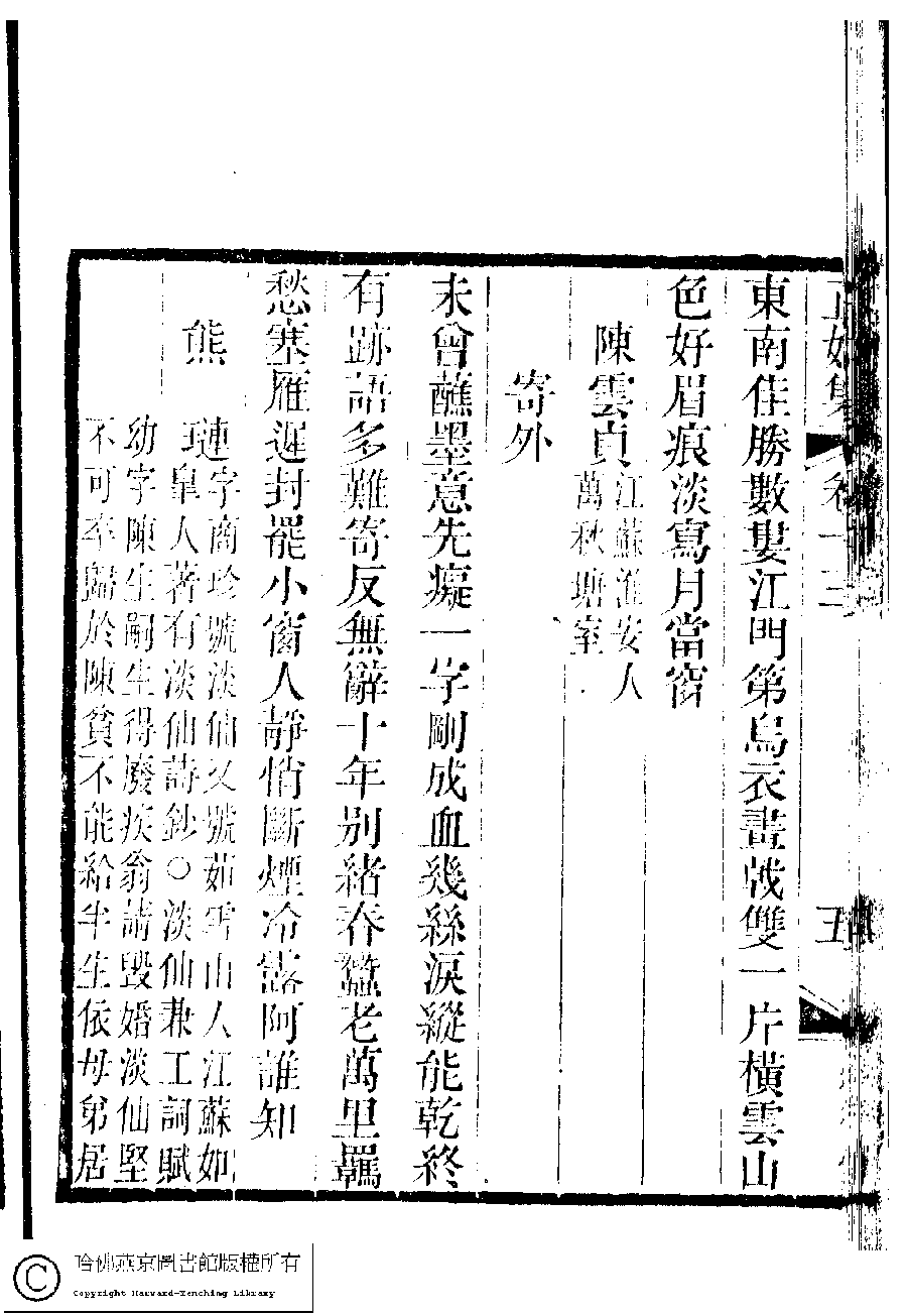 | (PRINT FRIENDLY VERSION) 國朝閨秀正始集﹕二十卷﹐附錄﹕一卷﹐補遺﹕一卷﹐又附題詞﹕一卷(清惲珠輯)。清道光十一年(1831)紅香館刻本。 ![]() Page : 13.6a | click for larger image | 國朝閨秀正始集﹕二十卷﹐附錄﹕一卷﹐補遺﹕一卷﹐又附題詞﹕一卷(清惲珠輯)。清道光十一年(1831)紅香館刻本。![]() Page : 13.5b | click for larger image | Back |