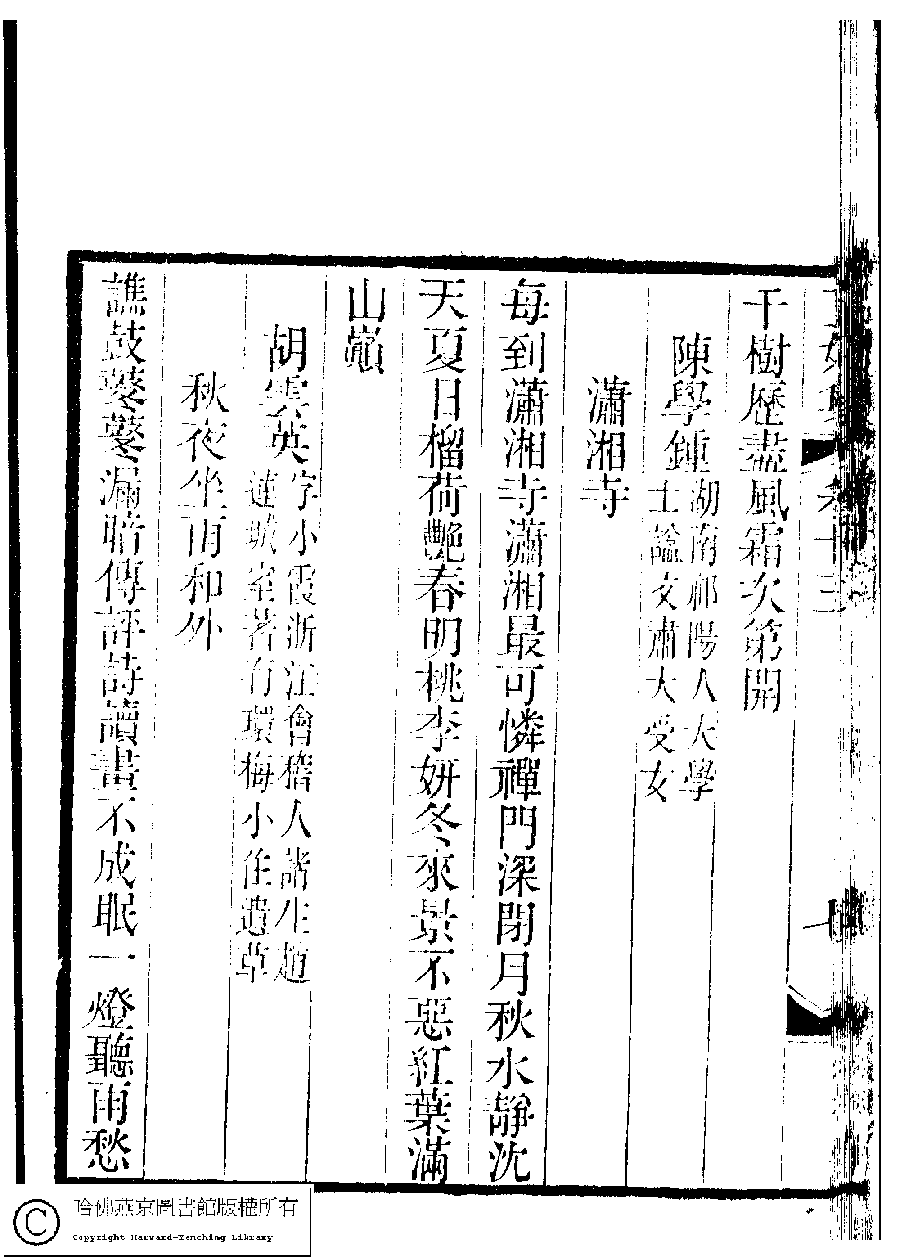 | (PRINT FRIENDLY VERSION) 國朝閨秀正始集﹕二十卷﹐附錄﹕一卷﹐補遺﹕一卷﹐又附題詞﹕一卷(清惲珠輯)。清道光十一年(1831)紅香館刻本。 ![]() Page : 13.7b | click for larger image | Back |