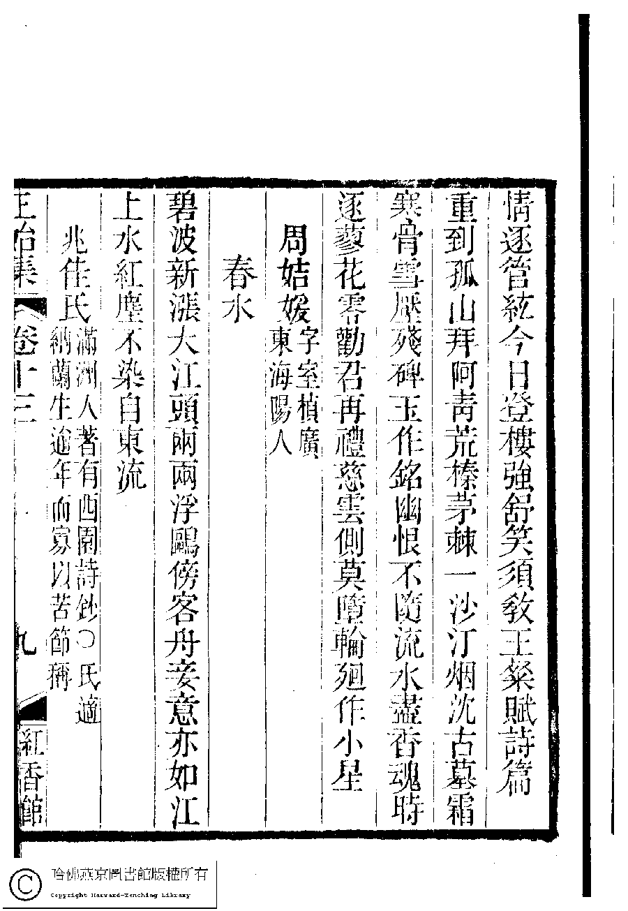 | (PRINT FRIENDLY VERSION) 國朝閨秀正始集﹕二十卷﹐附錄﹕一卷﹐補遺﹕一卷﹐又附題詞﹕一卷(清惲珠輯)。清道光十一年(1831)紅香館刻本。 ![]() Page : 13.9a | click for larger image | Back |