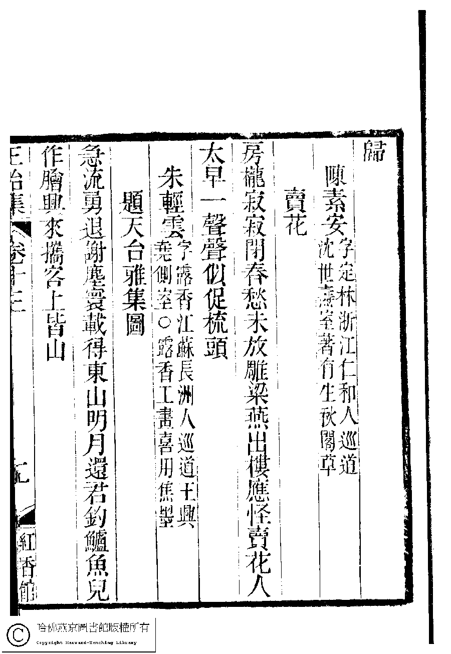 | (PRINT FRIENDLY VERSION) 國朝閨秀正始集﹕二十卷﹐附錄﹕一卷﹐補遺﹕一卷﹐又附題詞﹕一卷(清惲珠輯)。清道光十一年(1831)紅香館刻本。 ![]() Page : 13.19a | click for larger image | Back |