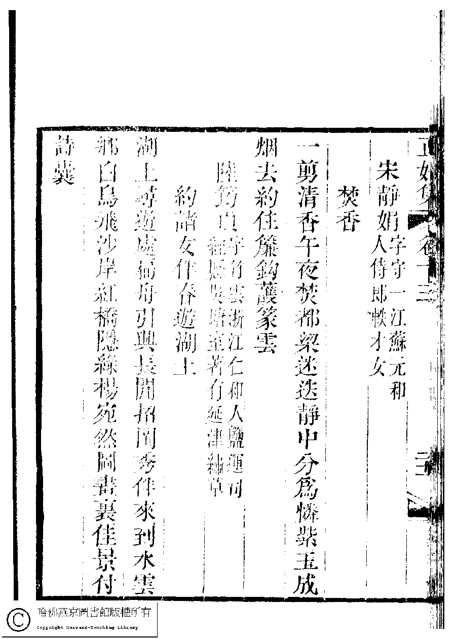 | (PRINT FRIENDLY VERSION) 國朝閨秀正始集﹕二十卷﹐附錄﹕一卷﹐補遺﹕一卷﹐又附題詞﹕一卷(清惲珠輯)。清道光十一年(1831)紅香館刻本。 ![]() Page : 13.21b | click for larger image | Back |